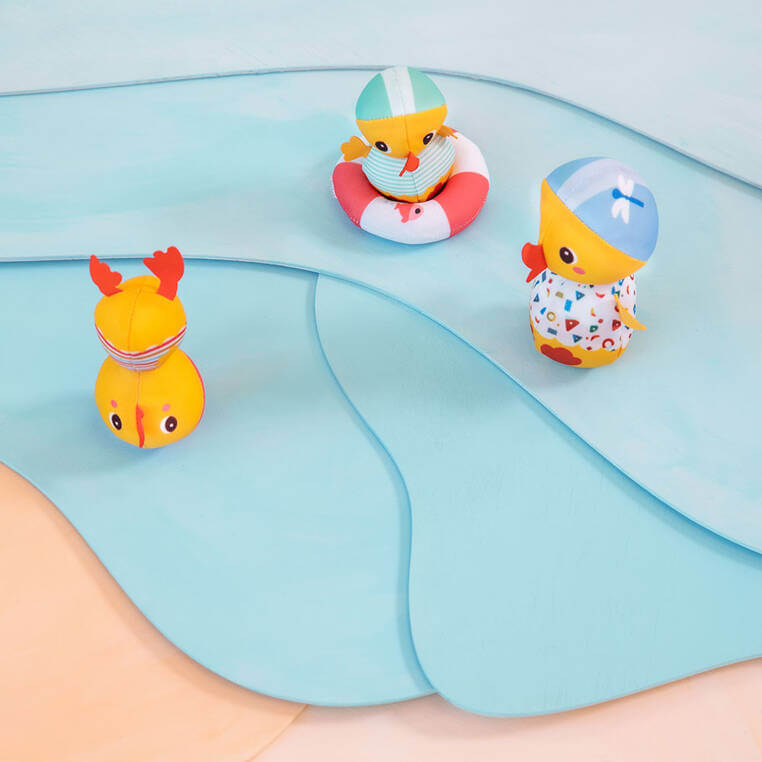 Wykonane są z miękkiego, łatwego do czyszczenia i szybkoschnącego materiału oraz posiadają różne właściwości. Największa kaczuszka (mama) potrafi pływać i unosi się na wodzie, jedno z kaczątek wciąż nurkuje (posiada specjalne obciążenie w głowie), a drugie pływa w kole ratunkowym. Zabawka jest perfekcyjnie wykończona, z dbałością o każdy szczegół i w pełni bezpieczna dla dziecka. Umila czas spędzony w kąpieli, a przy okazji stymuluje sensorycznie (wystające łapki i dzióbki), rozwija sprawność motoryczną (chwyt, wkładanie i wyjmowanie z koła) oraz wyobraźnię (snucie opowieści).