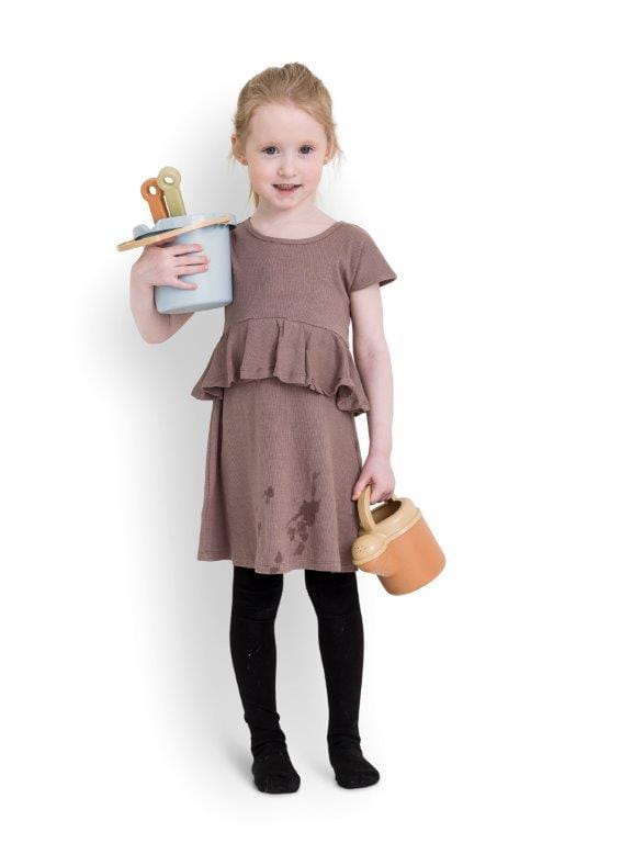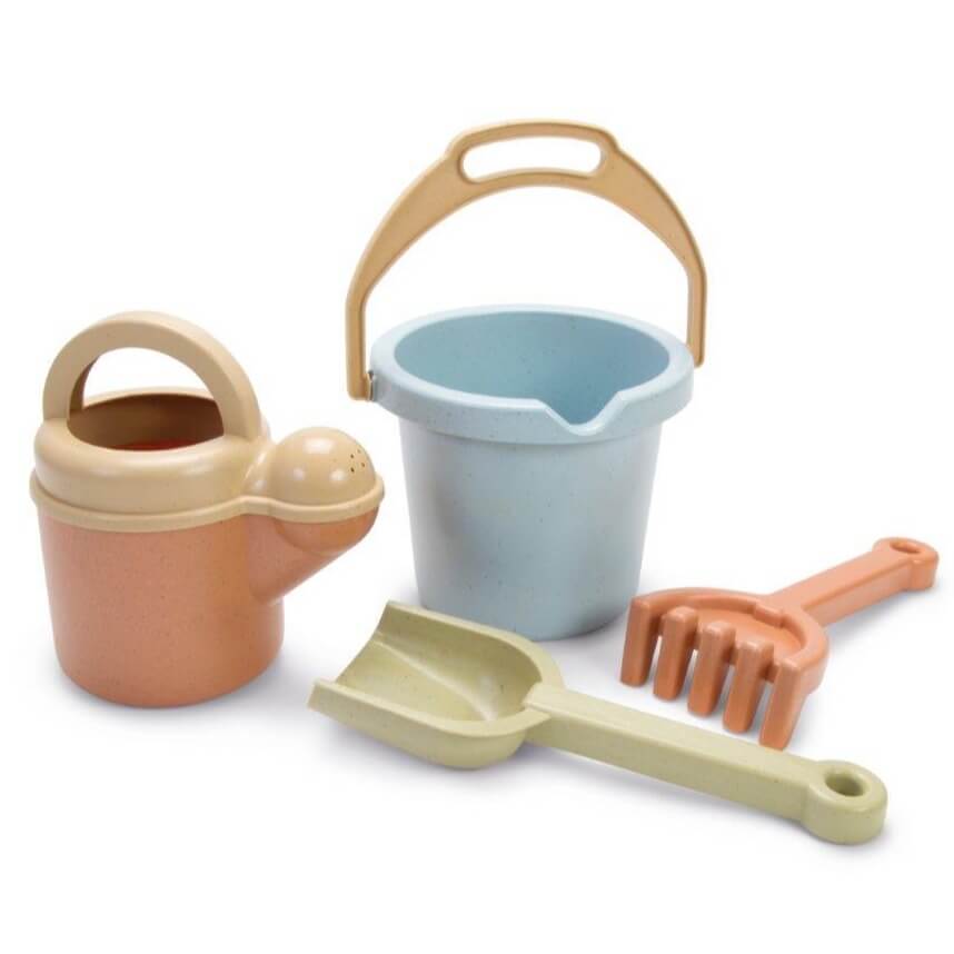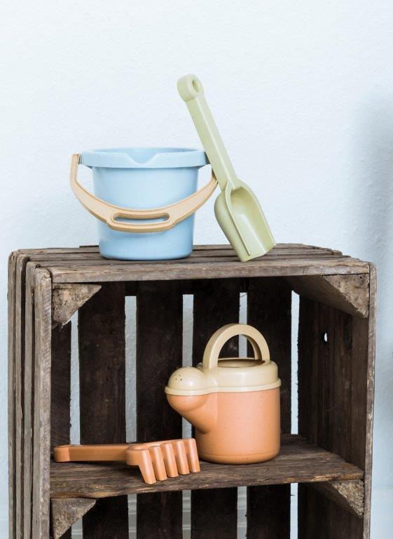 Ten śliczny zestaw do piasku w stonowanych, naturalnych kolorach jest niezbędny do zabawy w piaskownicy lub na plaży. W skład zestawu wchodzi wiaderko, konewka, łopatka