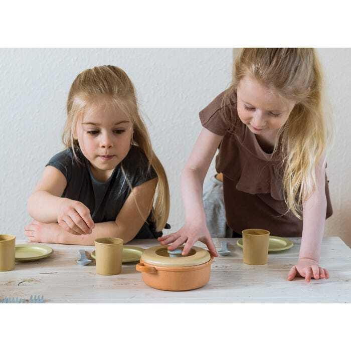 Wspaniały zestaw obiadowy z garnkiem i zastawą stołową w stonowanych, naturalnych kolorach zawiera 4 pełne nakrycia dla 4 osób: talerze, sztućce i kubki. Zestaw idealnie nadaje się zarówno do zabawy w pomieszczeniu, jak i na zewnątrz. Łatwo go wyczyścić w zmywarce. Gwarantuje godziny zabawy malucha i całej rodziny.