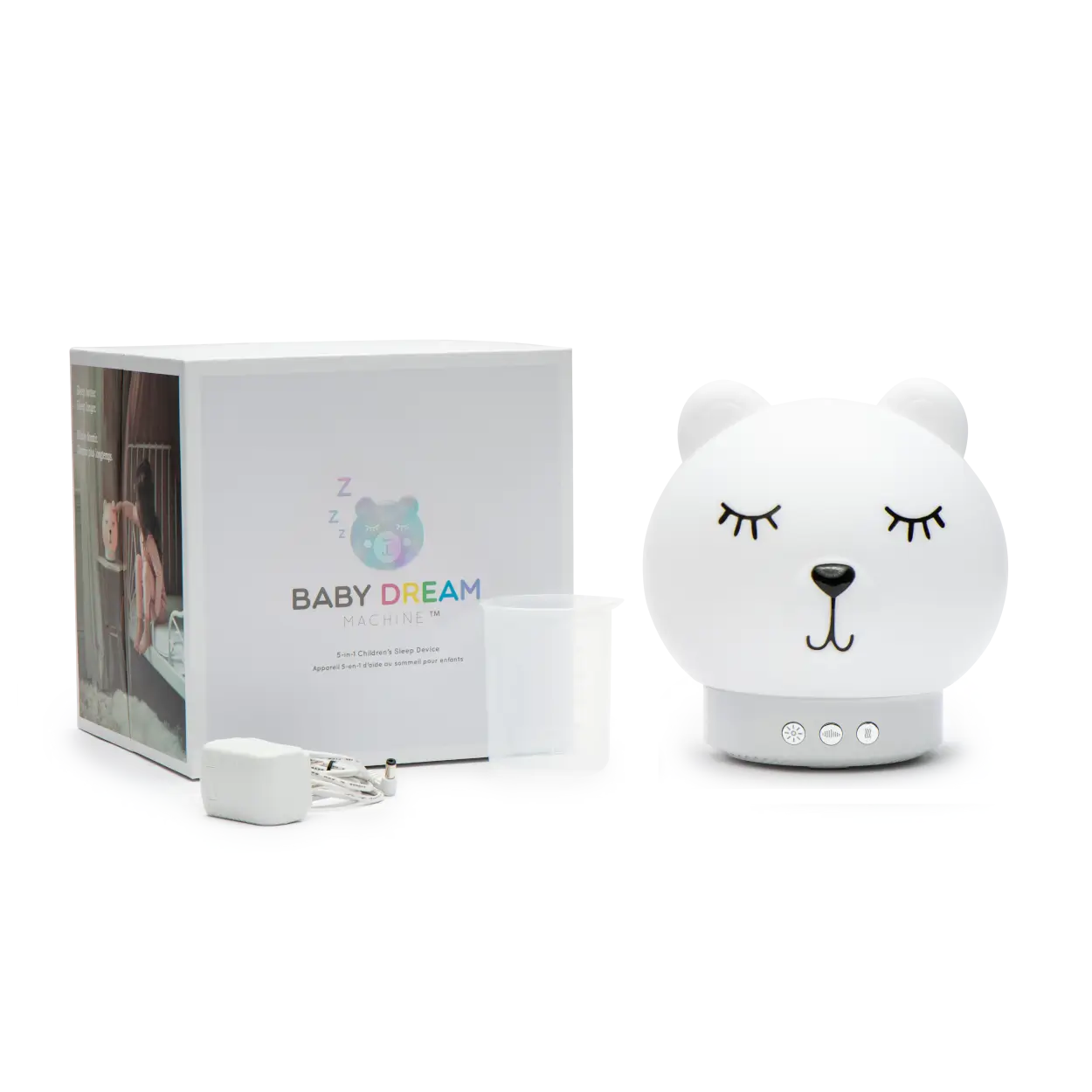 Posiada kształt uroczego misia, który będzie doskonale prezentował się w każdym pokoju dziecięcym. Urządzenie korzysta z 5 naukowo udowodnionych funkcji, aby pomóc zrelaksować dziecko, wyciszyć je i sprawić, że zasypianie stanie się łatwiejsze, a głęboki sen dłuższy i bardziej jakościowy. Baby Dream Machine to urządzenie 5 w 1, łączy w sobie funkcje lampki nocnej wyposażonej również w czerwone światło, nawilżacza powietrza, urządzenia do aromaterapii oraz generatora różowych szumów - które sprawią, że wszystkie Wasze noce będą udane.