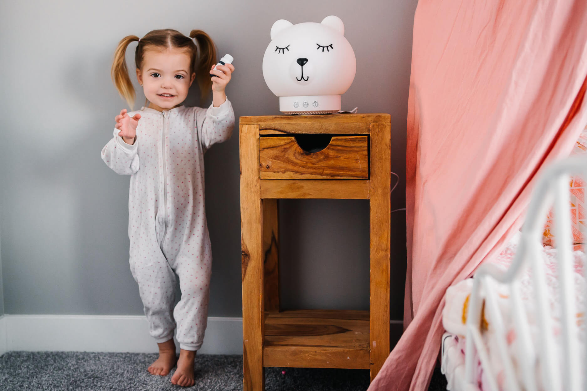- Aromaterapia: Pomaga uzyskać lepszą jakość snu i zrelaksować maluszka. Dzięki wykorzystaniu dedykowanych urządzeniu olejków może również wspomagać proces leczenia dziecka w trakcie przechodzenia infekcji układu oddechowego i kataru.