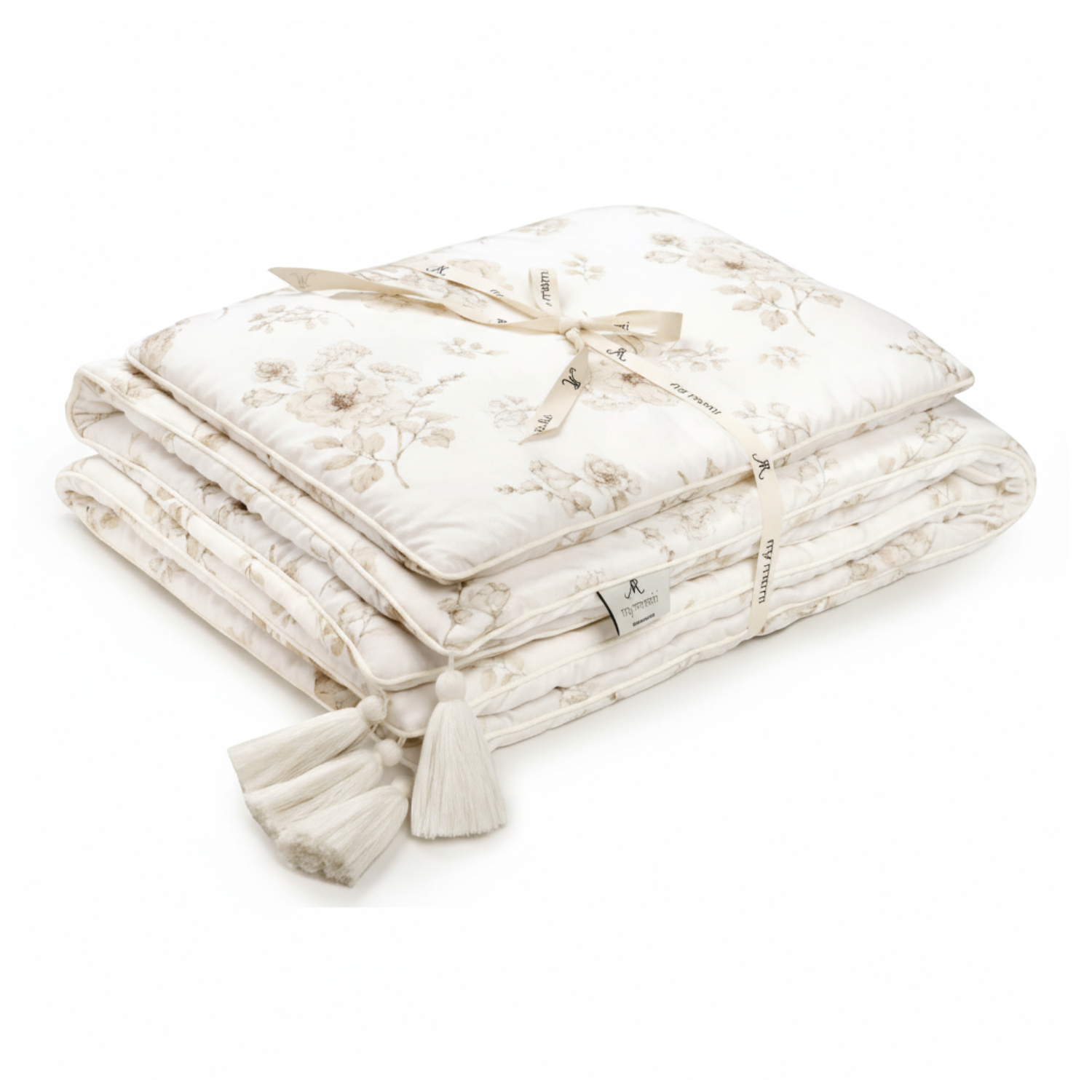 Pościel na stałe zszyta z antyalergicznym, oddychającym wypełnieniem, wykończona lamówką i czterema naturalnymi chwostami.