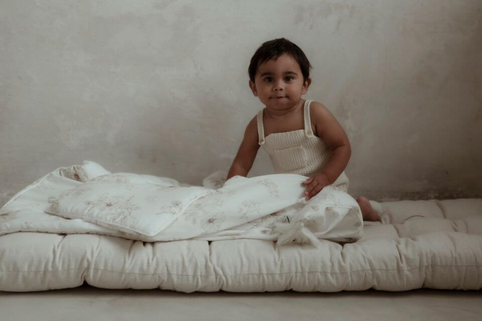 Zestaw zawiera kołderkę i płaską, bezpieczną dla niemowląt poduszkę.