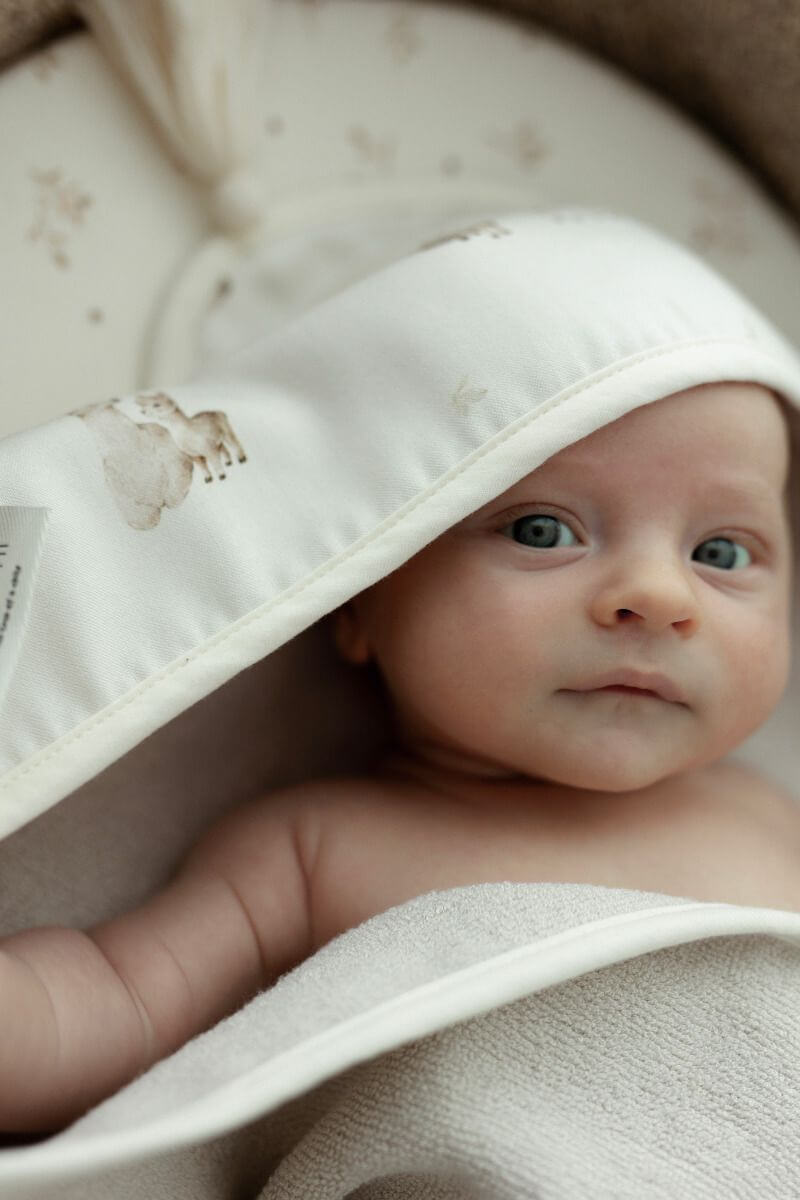 Ręcznik posiada na kapturku oryginalny wzór, z tyłu natomiast funkcjonalną szelkę na szyję rodzica, ułatwiającą codzienną pielęgnację. Takie rozwiązanie pozwala rodzicowi przytulić maluszka bezpośrednio po kąpieli, dając poczucie bliskości i bezpieczeństwa. Sprawdzi się idealnie w domu przy codziennej kąpieli, a także na basenie czy na plaży.