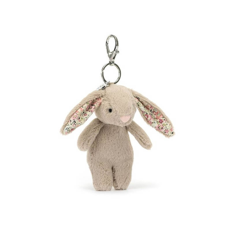 Brelok marki Jellycat w kształcie przeuroczego, mięciutkiego króliczka w kolorze beżowym ze srebrnym medalikiem i poręczną zawieszką
