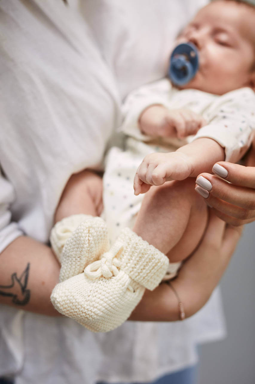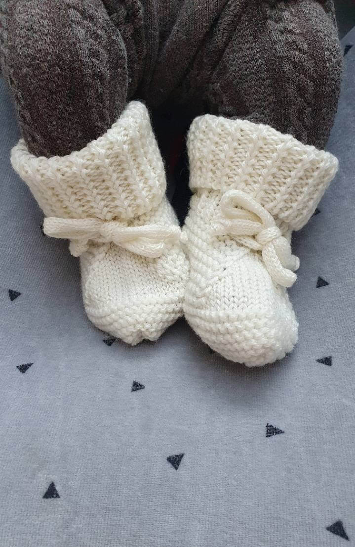 Naturalna przędza, bez domieszek zapewnia, że są ciepłe i idealne na jesień i zimę. Mają miękką, nie usztywnioną podeszwę, są elastyczne i dopasują się do stópek dziecka. Długa, wywijana cholewka sprawia, że buciki się nie zsuwają.