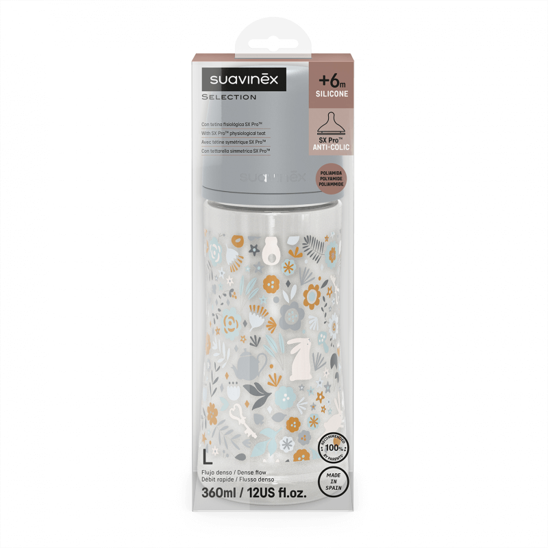 Jest wykonana z przezroczystego plastiku, co sprawia, że jest niezwykle lekka i idealna do codziennego użytku. Butelka o pojemności 360ml wyposażona jest w smoczek SX Pro o szybkim przepływie idealnym dla starszych dzieci, pozwala na przepływ gęstych cieczy i płynnych owsianek.