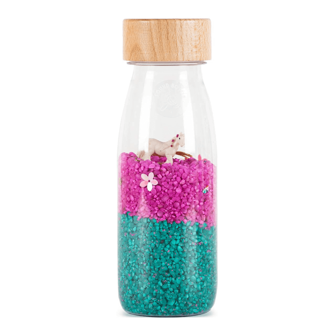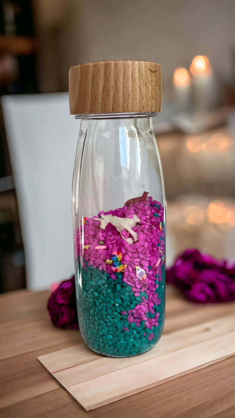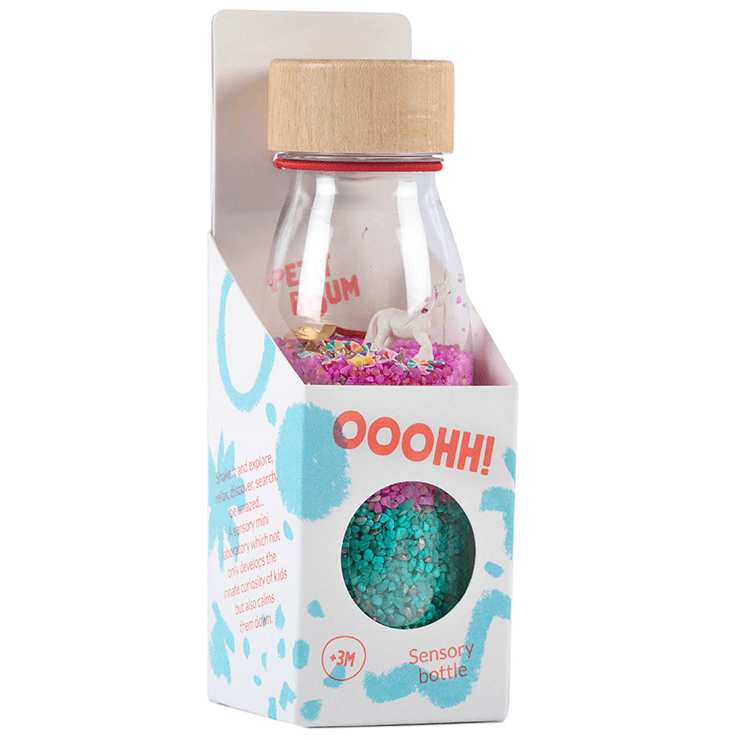 Butelki sensoryczne od Petit Boum to kolorowy świat zamknięty w niewielkiej, przystępnej dla dziecka formie. Bawią, uczą i stymulują wyobraźnię! Pozwól swojemu dziecku poruszać, potrząsać i manipulować butelką, aby odkrywać kolory i figurki tematyczne zamknięte w butelce. Różnorodna zawartość butelek pozwala odkrywać nowe, ciekawe dźwięki charakterystyczne dla ukrytych w butelce elementów. Zabawa butelką od Petit Boum rozwija zmysły i wyobraźnię dziecka! Czy rozpoznasz butelki po ich dźwiękach? Czy znajdziesz w środku syrenę? :)