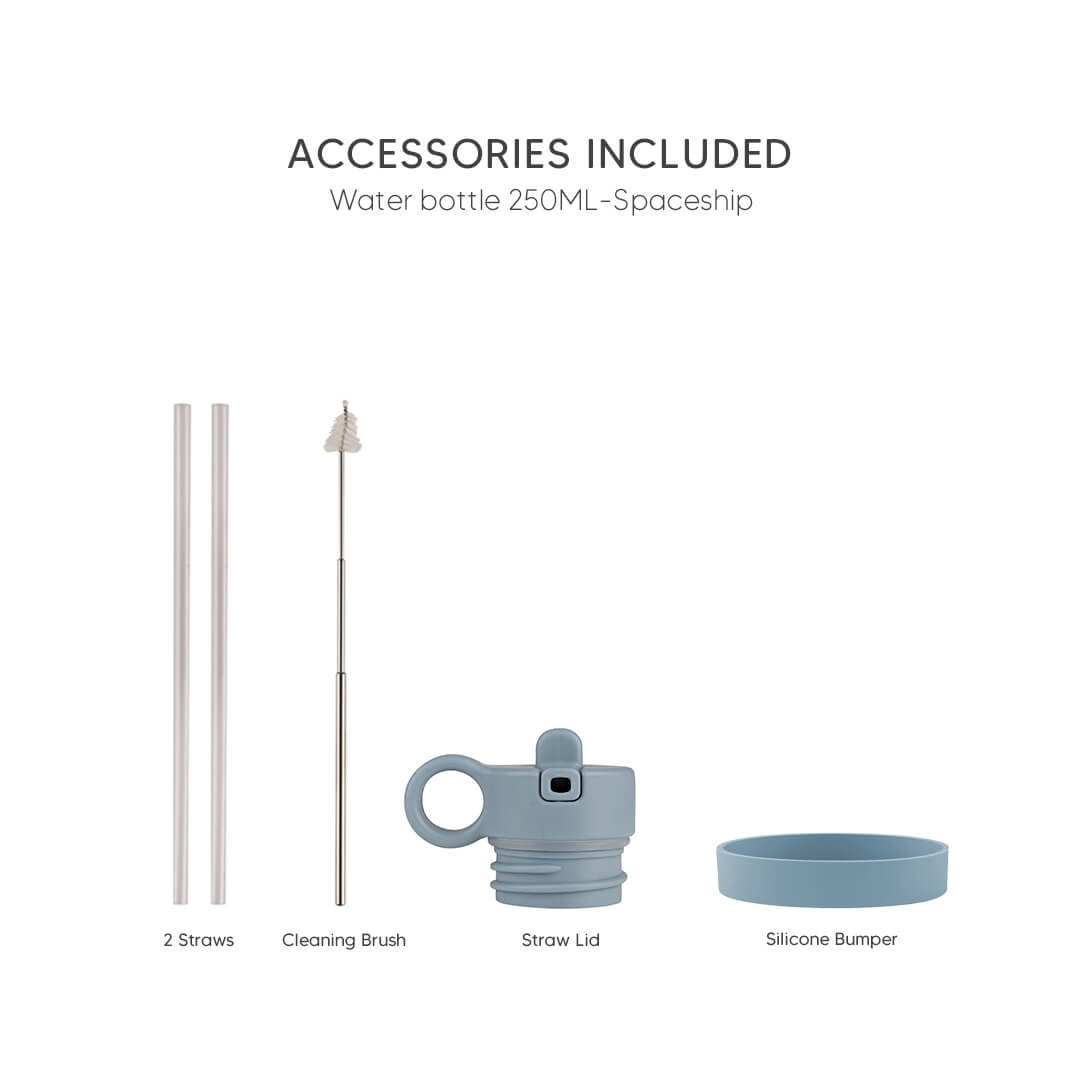 - W zestawie znajduje się szczoteczka do czyszczenia, silikonowy ochraniacz na dno, nakrętka i 2 słomki