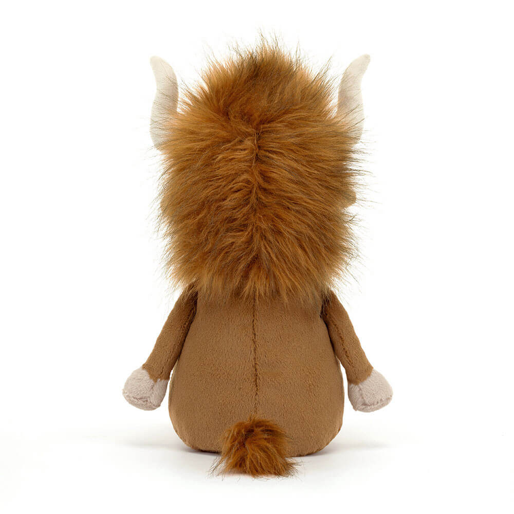 Ma długie i delikatne rogi, klapnięte uszka, wspaniałą kudłatą grzywę w pysznym karmelowym kolorze, miłą buźkę, mięciutki brzuszek, zamszowe kopytka i puchaty ogonek. Ten uroczy byczek jest zawsze gotowy do zabawy i przytulania! Pluszak został uszyty z najwyższej jakości, trwałych i bezpiecznych dla dzieci materiałów.