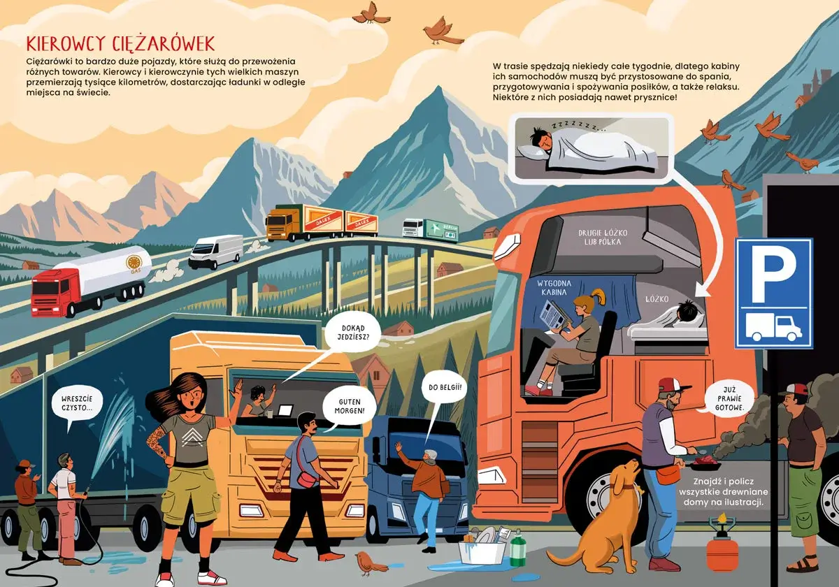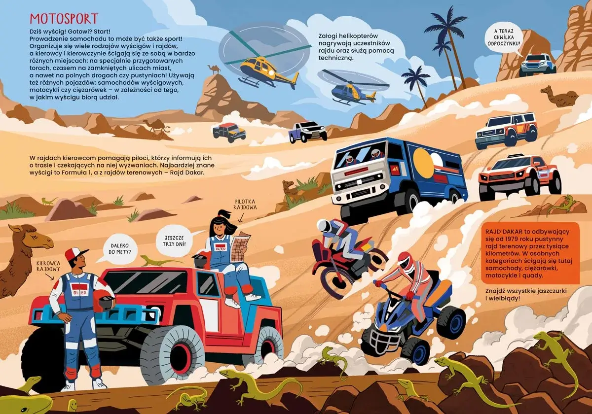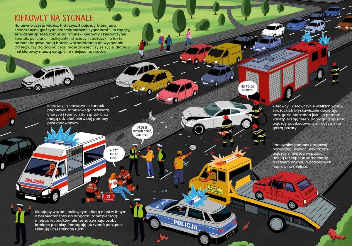 Kierowcy i kierowczynie prowadzą rozmaite pojazdy: niewielkie samochody osobowe i ogromne ciężarówki, taksówki wodne i maszyny budowlane, radiowozy i autobusy miejskie, a także wiele innych aut. Jeżdżą bardzo blisko lub wyruszają w długie wielodniowe trasy. Dbają o bezpieczeństwo swoje i swoich pasażerów, a niektórzy są po to, by udzielać pomocy innym. Wszyscy zaś muszą poznać wiele przepisów ruchu drogowego i stosować się do nich – to początek wielkiej przygody za kierownicą wymarzonego samochodu!