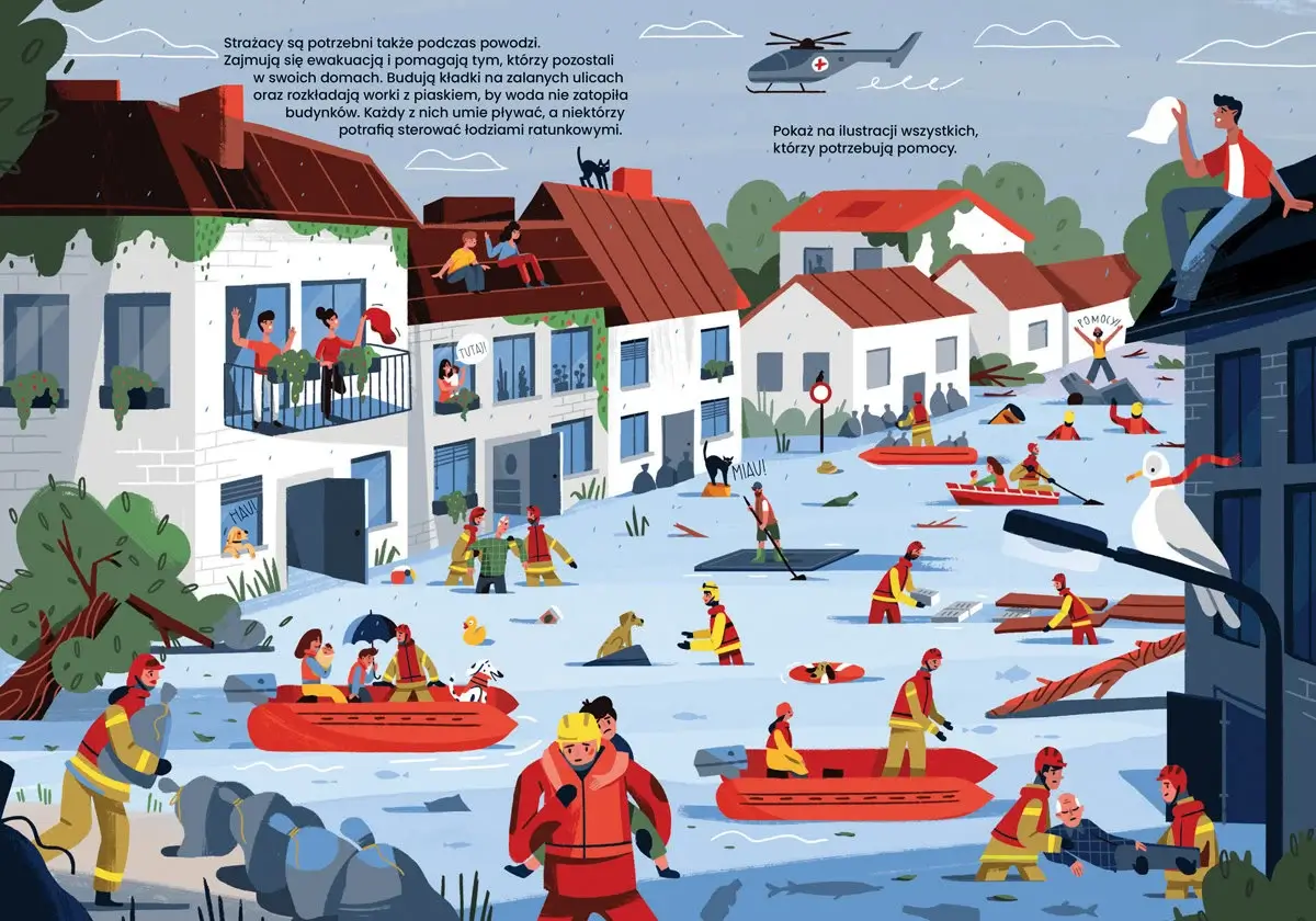 Ale gdy tego akurat nie robią, wcale nie leniuchują – mają wiele innych zajęć! Pomagają ludziom podczas powodzi czy wypadków drogowych, organizują akcje poszukiwawcze, gdy ktoś zaginie (na przykład w lesie, w górach czy pod gruzami), a także udzielają profesjonalnej pierwszej pomocy. Poza tym stale trenują, by być w dobrej formie – są naprawdę bardzo zajęci!