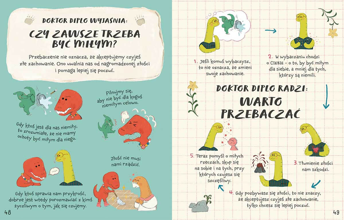 Małe dinozaury martwią się różnymi rzeczami, ale też wiele tematów je po prostu ciekawi, dlatego zadają mnóstwo pytań. Z pomocą mądrego wioskowego terapeuty i przyjaciela, dr Diplo, uczą się rozmawiać o ważnych życiowych sprawach. Okazuje się, że gdy lepiej rozumieją świat, same też lepiej się czują. Zwłaszcza, że każdą opowiastkę uzupełniają proste ćwiczenia, które pomagają się wyciszyć, poczuć wdzięczność, ukoić smutek czy obniżyć lęk.