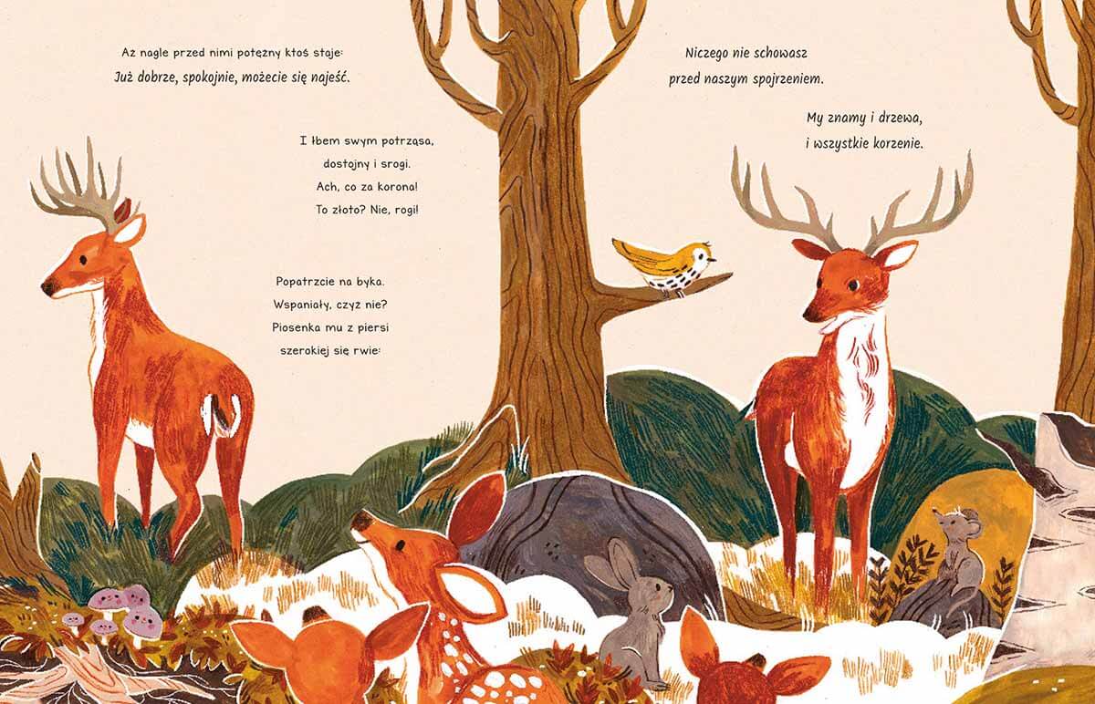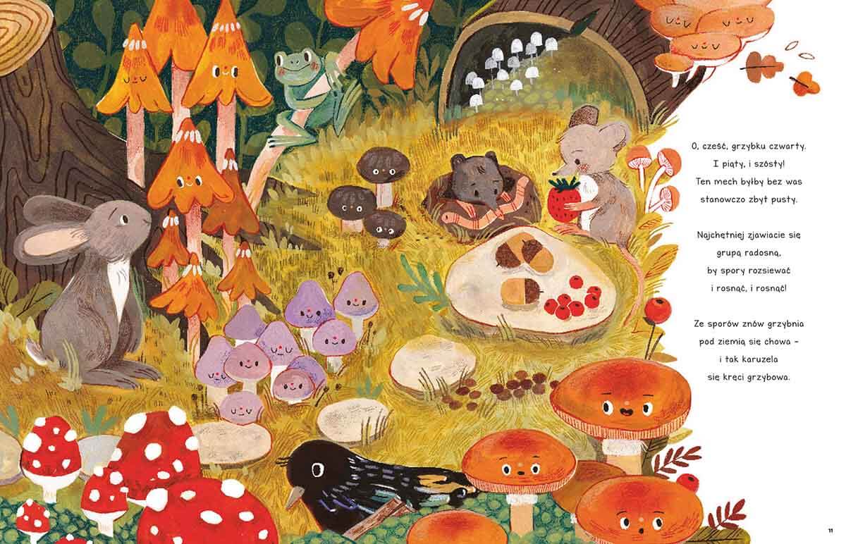Ten czarowny świat udało się zamknąć w równie niezwykłej książce - „Cuda w lesie”. To barwna opowieść o dużych i małych mieszkańcach lasu, o niezwykłych zjawiskach, które zachodzą w naturze każdego dnia i o tym, że wszystkie elementy w przyrodzie są ze sobą powiązane. Z dziewięciu opowieści młodzi czytelnicy dowiedzą się m.in., jak rosną grzyby i czy drzewa ze sobą rozmawiają; zrozumieją, jak pożyteczne są żuki i pszczoły; jak kijanka zamienia się w żabę; co ćma widzi w nocy i czym różni się życie ptaków i ssaków w stadzie. Niezwykłości przyrody zostały przedstawione w równie oryginalny sposób - za pomocą… wierszowanych opowieści.