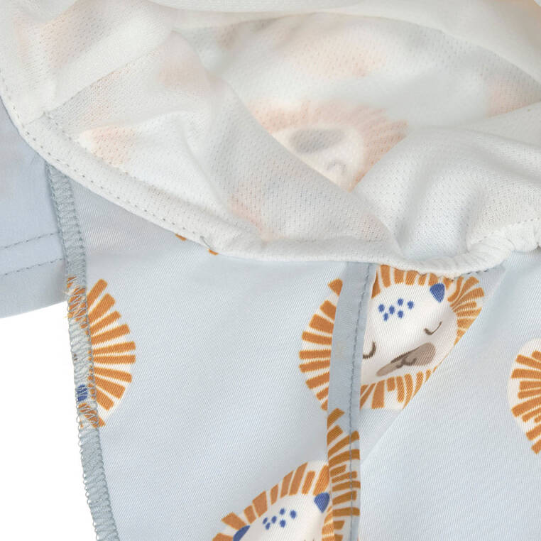 Wykonana jest z miękkiej, przyjemnej do noszenia i szybkoschnącej mikrofibry z faktorem UPF 80. Ma daszek i dłuższy tylny panel, dodatkowo chroniący kark. Idealna zarówno na odkryty basen, jak i na plażę, do kąpieli w jeziorze czy morzu oraz wszelkich wodnych zabaw. Dzięki bocznym sznureczkom może być stabilnie wiązana pod szyją. Nie przemaka i jest łatwa w pielęgnacji. Wzór Lion (Lew) to multiprint w słodkie śpiące lewki z karmelową grzywą na jasnoniebieskim tle.