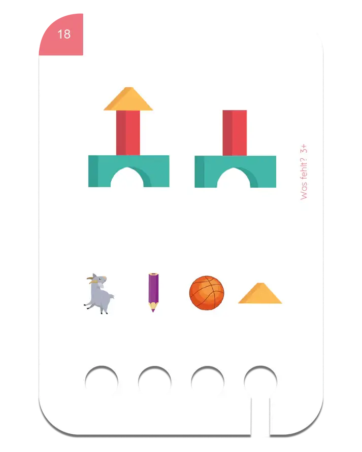 Zestaw Czego Brakuje zawiera 48 starannie dopasowanych zadań na 24 kartach. Zestaw ten rozwija spostrzegawczość, koncentrację oraz umiejętność logicznego myślenia poprzez identyfikację brakujących elementów na obrazkach.