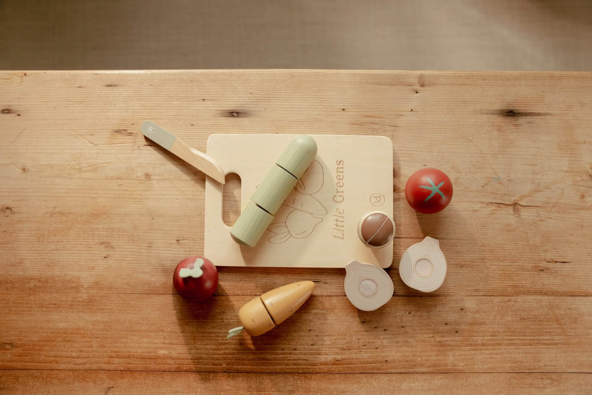 Zestaw składający się z warzyw, takich jak: marchewka, ogórek, pomidor, cebula, burak i pieczarki oraz deseczka wraz z bezpiecznym, drewnianym nożykiem. Wszystko można przeciąć na pół i łatwo skleić ponownie za pomocą rzepów. Warzywa idealnie sprawdzą się do nauki oraz wpajania maluchom zasad zdrowego odżywiania już od najmłodszych lat. Doskonałe uzupełnienie do naszej kuchennej serii. Dostępny również zestaw z owocami. Świetna zabawa gwarantowana!