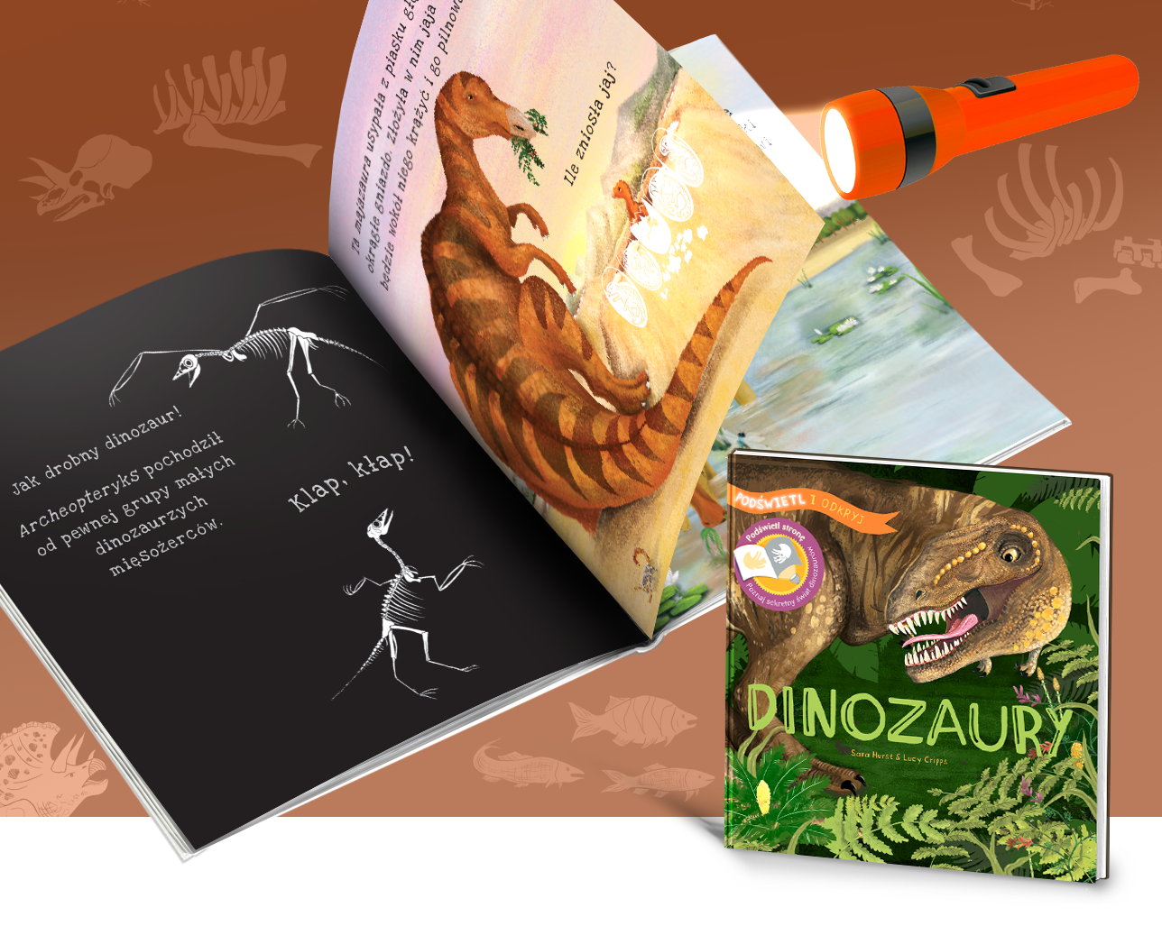 Ta niezwykła książka to doskonała pozycja dla najmłodszych fanów dinozaurów! Dzięki zastosowaniu specjalnej powłoki UV, latarka w rękach dziecka działa niczym rentgen. Wystarczy poświecić nią od tyłu na ilustracje lub spojrzeć pod światło, a naszym oczom ukażą się kolejne, ukryte wcześniej sceny.