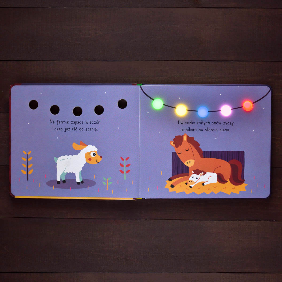 Opowiada o małej owieczce, która odwiedza wszystkie zwierzątka na farmie, by każdemu życzyć dobrej nocy przed spaniem. Owieczka mówi dobranoc konikom śpiącym na sianku, krówkom leżącym przy płocie, kurkom w kurniku oraz pieskom śpiącym w budzie by w końcu wrócić i zasnąć wtulona w mamę.