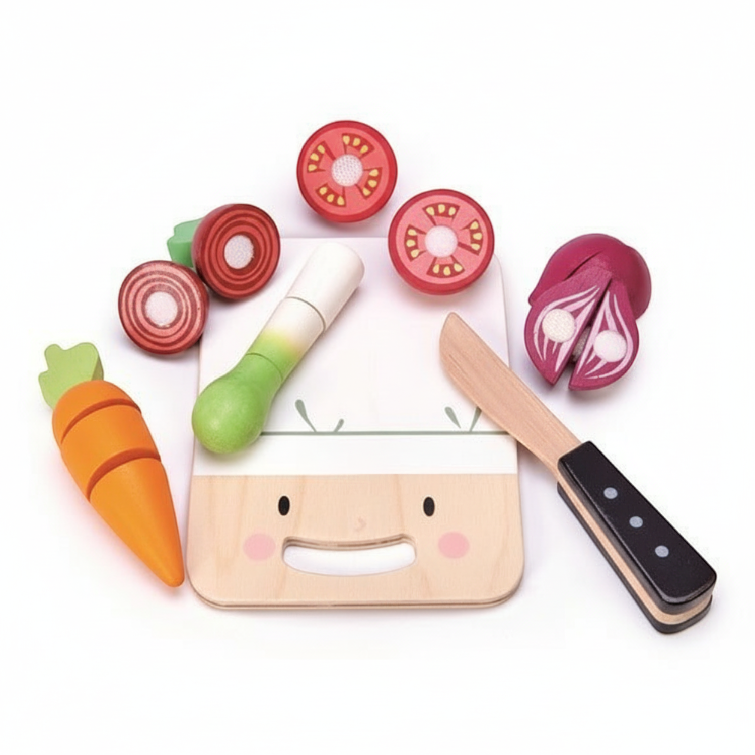 Deska do krojenia, drewniany nóż oraz warzywa do krojenia: cebula w czterech cząstkach, marchewka i por w trzech oraz burak i pomidor w dwóch cząstkach - połączonych za pomocą rzepów. Pyszne i zdrowe warzywka na pewno zasmakują misiom i lalkom! Pamiętajcie, że spożywanie warzyw to podstawa zdrowego odżywiania!