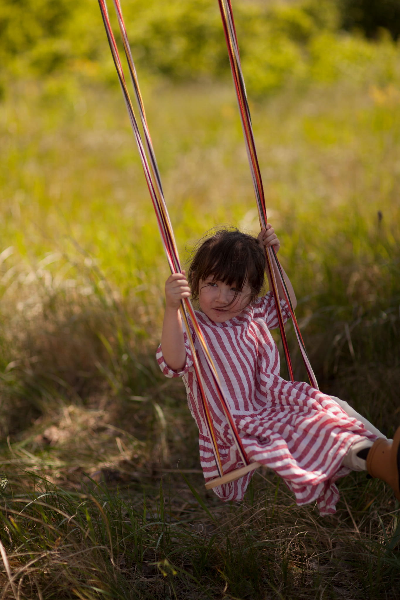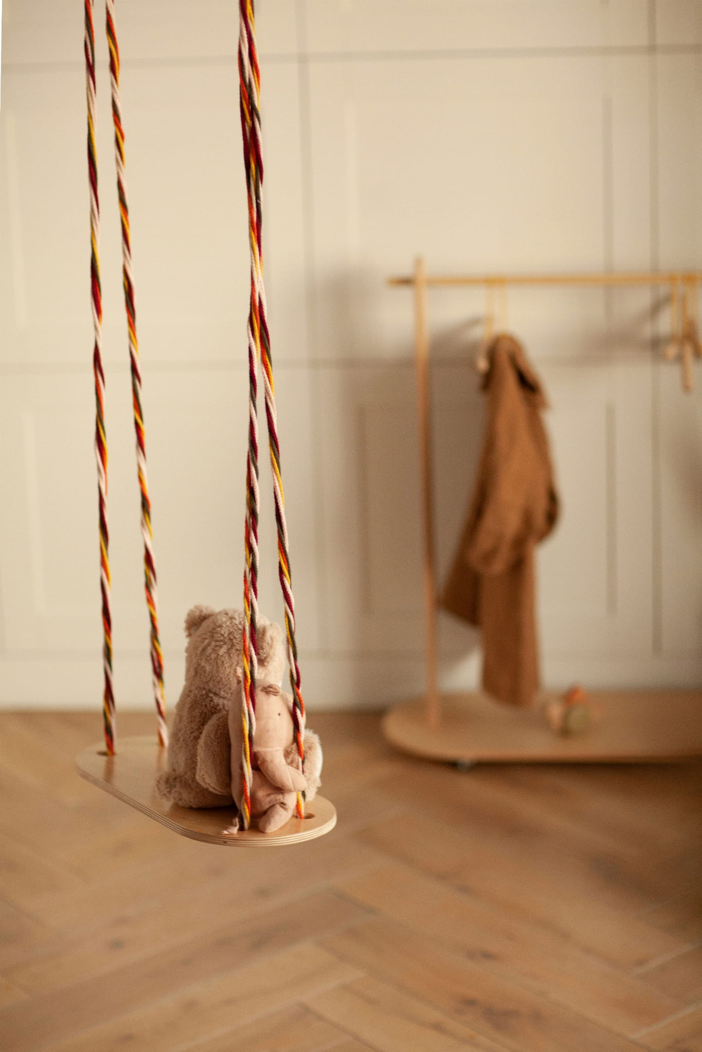 - przenośna drewniana huśtawka na sznurkach