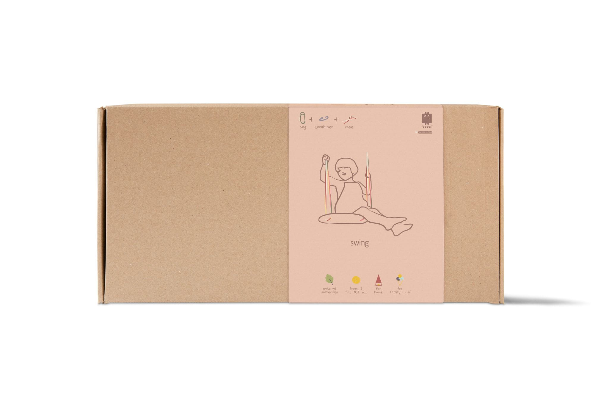W opakowaniu: drewniana huśtawka z bawełnianym sznurkiem, 2 karabińczyki i bawełniana torba