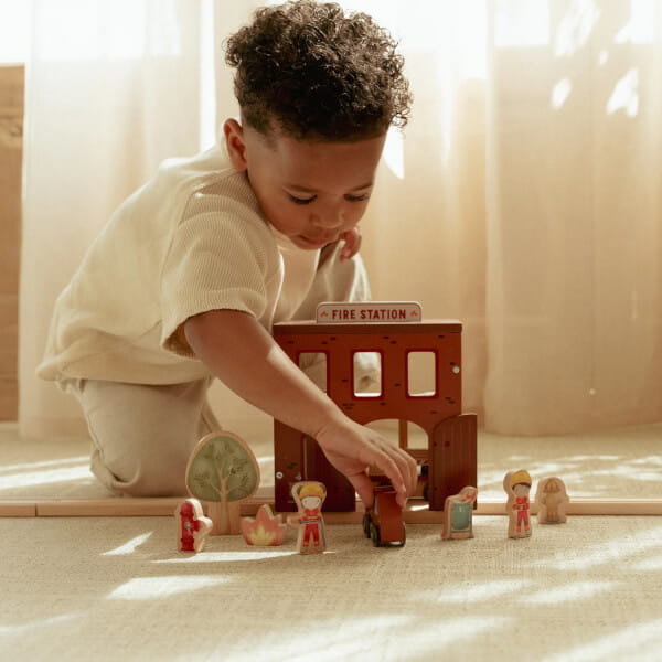 Zestaw zawiera remizę strażacką , auto straży pożarnej z wysuwaną drabiną, figurki strażaków wraz z psem pomocnikiem, hydrant , drzewka oraz ogień który trzeba ugasić. Elementy są starannie wykonane z drewna z certyfikatem FSC (Forest Stewardship Council), malowane są bezpiecznymi farbami na bazie wody. Piękna, delikatna kolorystyka.