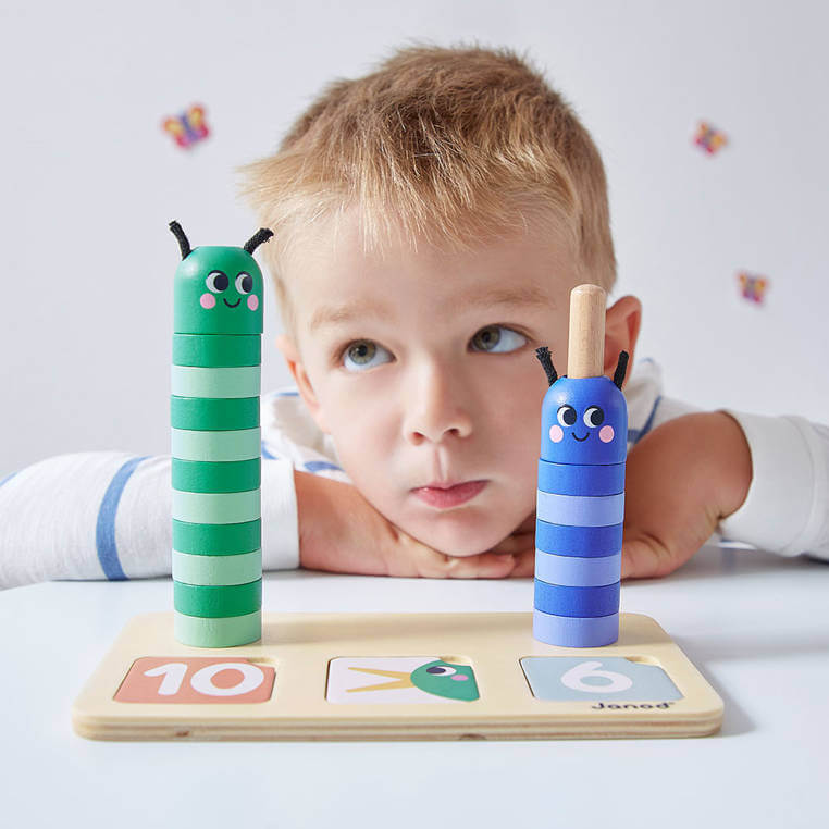 To idealna zabawka edukacyjna dla dzieci od 3. roku życia. Pomoże ona maluchom zrozumieć wartość danych liczb, rozpoznawać ich różne reprezentacje oraz porównywać między sobą. Zestaw składa się z drewnianej podstawki z dwoma kołeczkami do układania piramidek-gąsienic i trzema wgłębieniami na karty. Na kartach liczby przedstawione są za pomocą cyfr, ale także palców u dłoni i oczek na kostce do gry. Zadaniem dzieci jest ułożenie gąsienic z liczby krążków odpowiadającej liczbie na karcie (musi ją najpierw rozpoznać), a następnie porównanie obu stworzeń. W komplecie są też karty ze znakami matematycznymi, oznaczającymi równość lub mniejszość/większość. Zabawka rozwija umiejętność obserwacji, zdolność liczenia i porównywania. Dołączona instrukcja pomoże w pełni wykorzystać możliwości układanki.