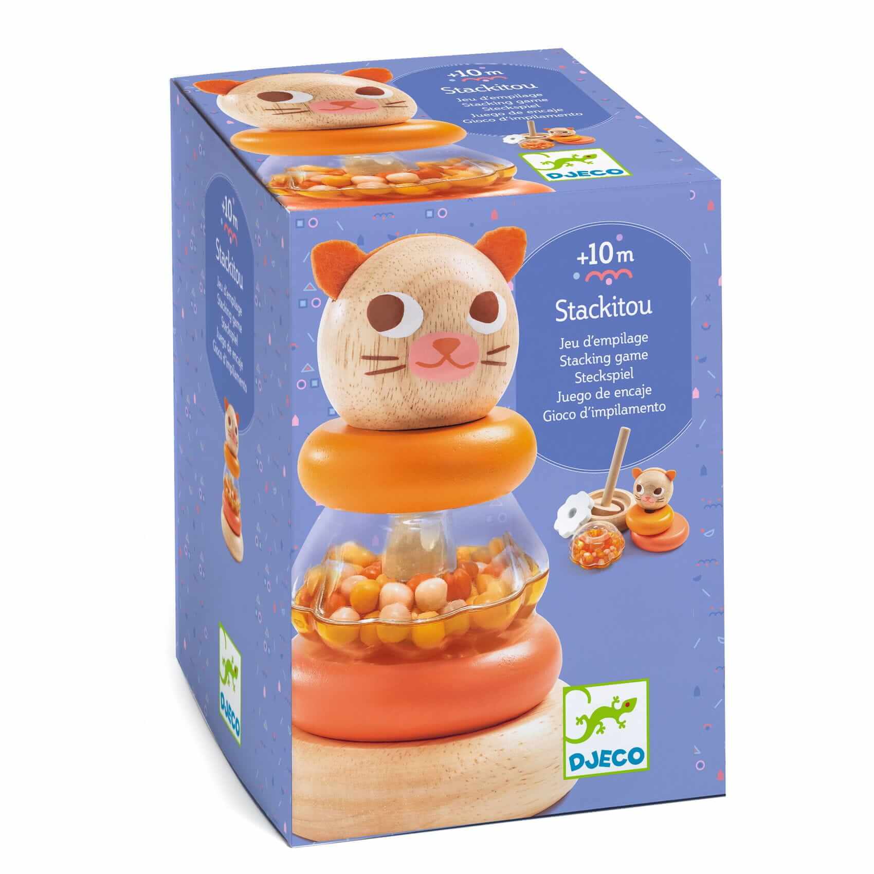 Drewniana zabawka, która polega na złożeniu kotka składającego się z 4 okręgów, zaczynając od największego. Jeden okręg jest przezroczysty i posiada w środku grzechoczące koraliki. Elementy zabawki są łatwe do chwycenia.