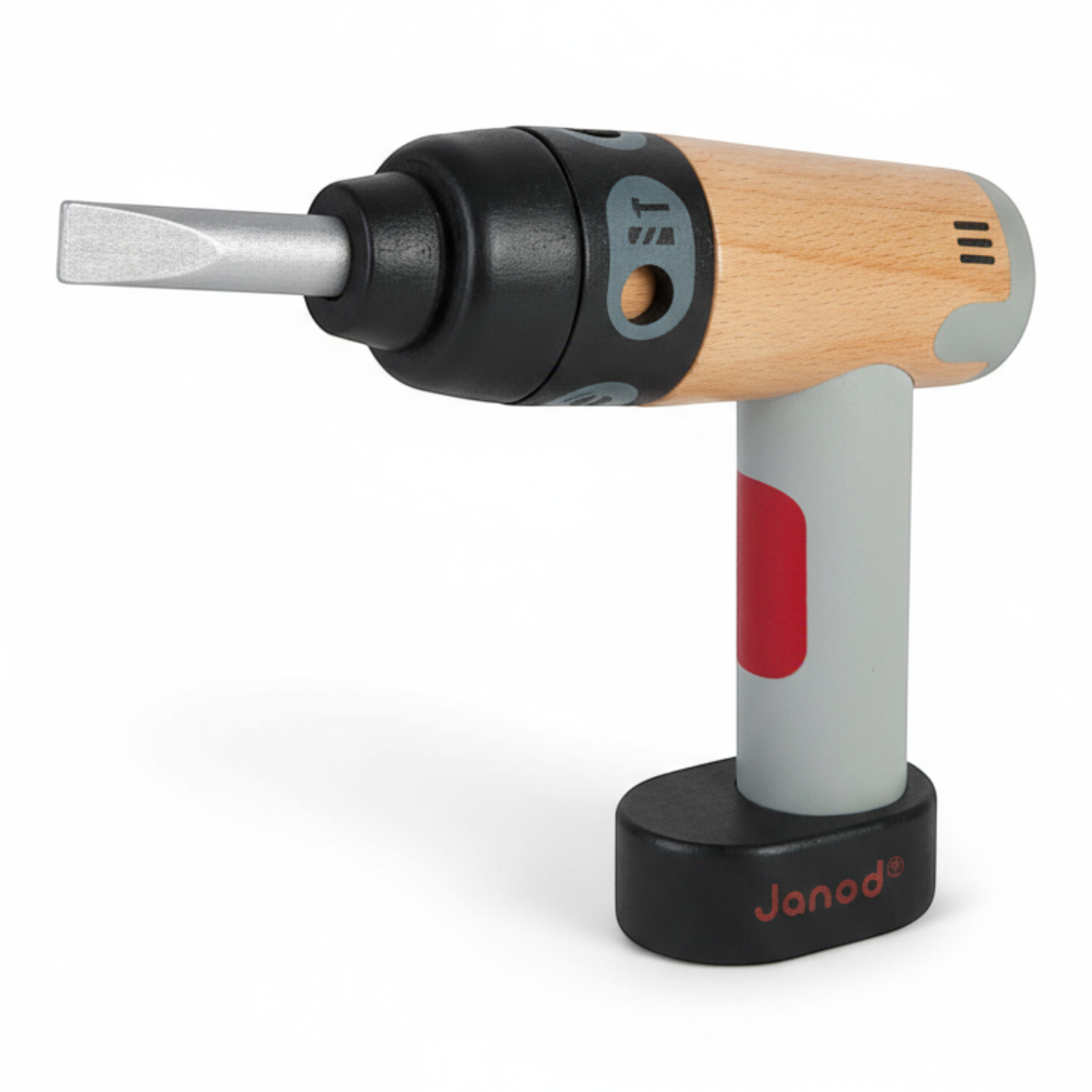 Zabawka z serii Brico'kids francuskiej marki JANOD kształtem doskonale imituje swój „dorosły” odpowiednik, posiada regulację zacisku i wymienne końcówki – wiertło oraz wkrętak (mocowane na magnes). Zabawka wspomaga rozwój zdolności manualnych dziecka, precyzję ruchów i koncentrację, stymuluje też wyobraźnię i zachęca do tworzenia historii oraz odgrywania sytuacji, znanych z obserwacji dorosłych. Narzędzie zaprojektowane zostało we Francji. Zapakowane jest w estetyczne, kartonowe pudełko. Idealnie nadaje się na prezent.
