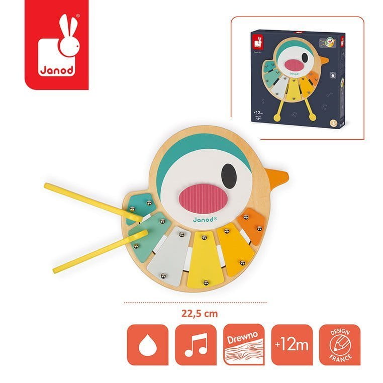 Zabawka cymbałki Ptaszek z serii Pure francuskiej marki JANOD pomaga rozwijać słuch, poczucie rytmu oraz zdolności muzyczne. Ma postać uroczego ptaszka, którego nóżki to wyjmowane drewniane pałeczki, za pomocą których można wystukiwać rytm na sześciu metalowych płytkach, umieszczonych wzdłuż brzuszka. Niebanalna zabawka wspiera rozwój wyobraźni, koncentracji i koordynacji ruchowej. Ma piękną pastelową kolorystykę, zapakowana jest w estetyczne, kartonowe pudełko w pastelowych kolorach. Idealnie nadaje się na prezent.