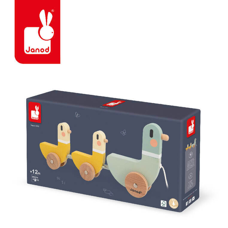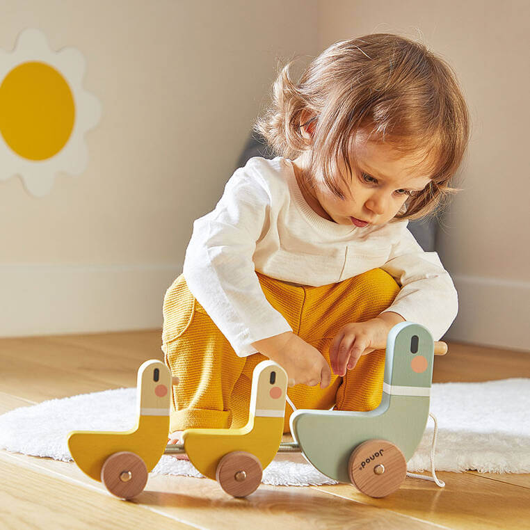 Drewniane kaczki do ciągnięcia z serii Sweet Cocoon francuskiej marki JANOD