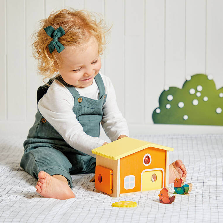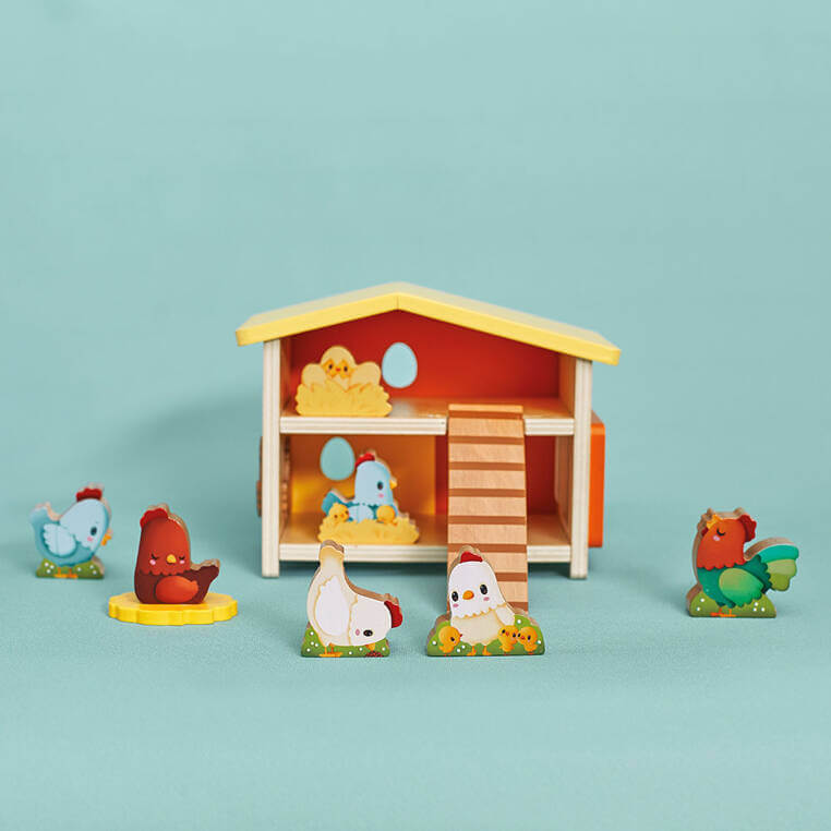 To piętrowy drewniany budynek z pochyłą platformą oraz 8 kurkami i kurczaczkami, które można umieszczać na dowolnych poziomach lub wokół niego, tworząc przy tym różne opowieści z życia na farmie. Okienko na górnym poziomie ma kształt jajka, a na dolnym – jednej z kurek, dzięki czemu pełni też rolę mini-sortera. Zabawka została zaprojektowana we Francji. Zapakowana jest w estetyczne kartonowe pudełko. Idealnie nadaje się na prezent.