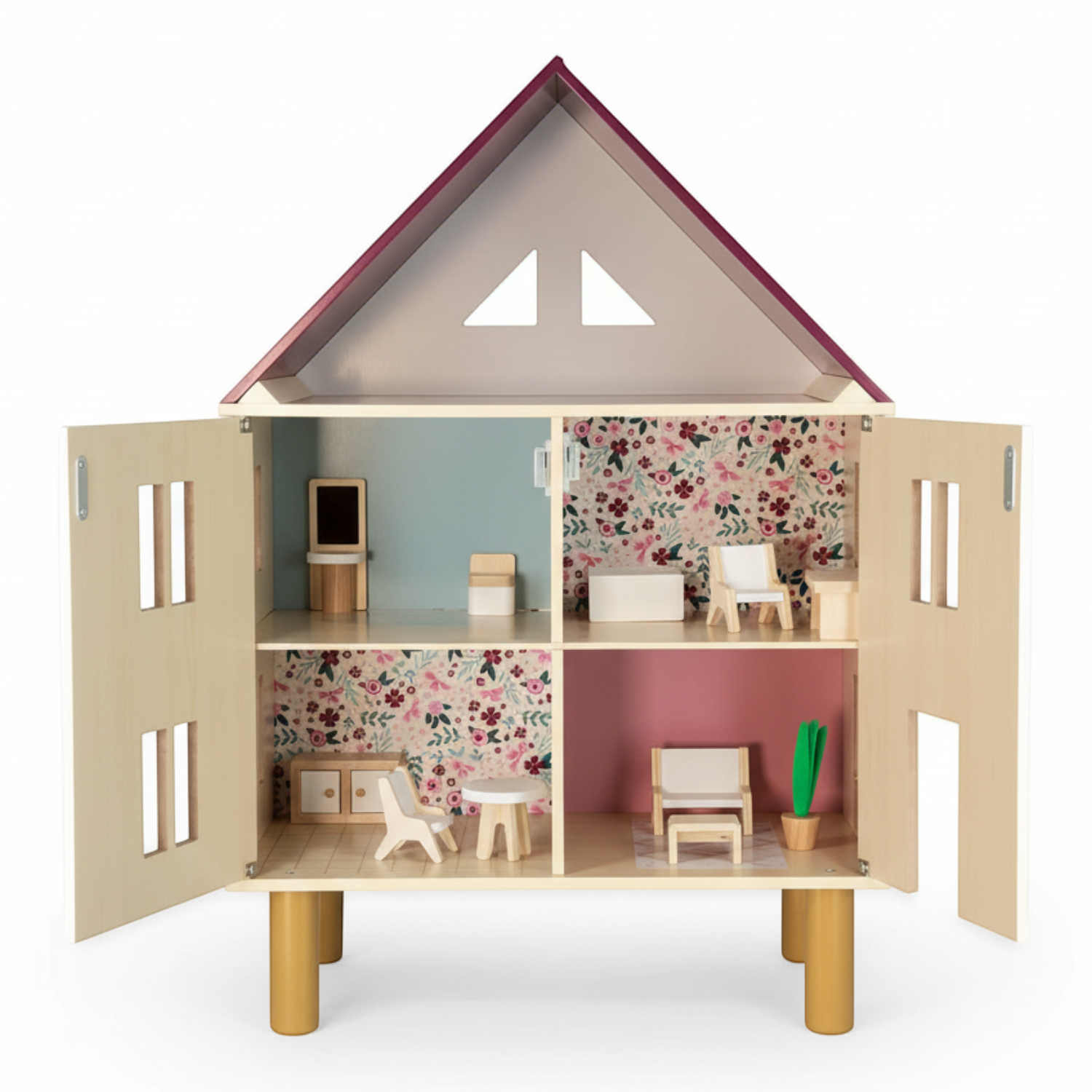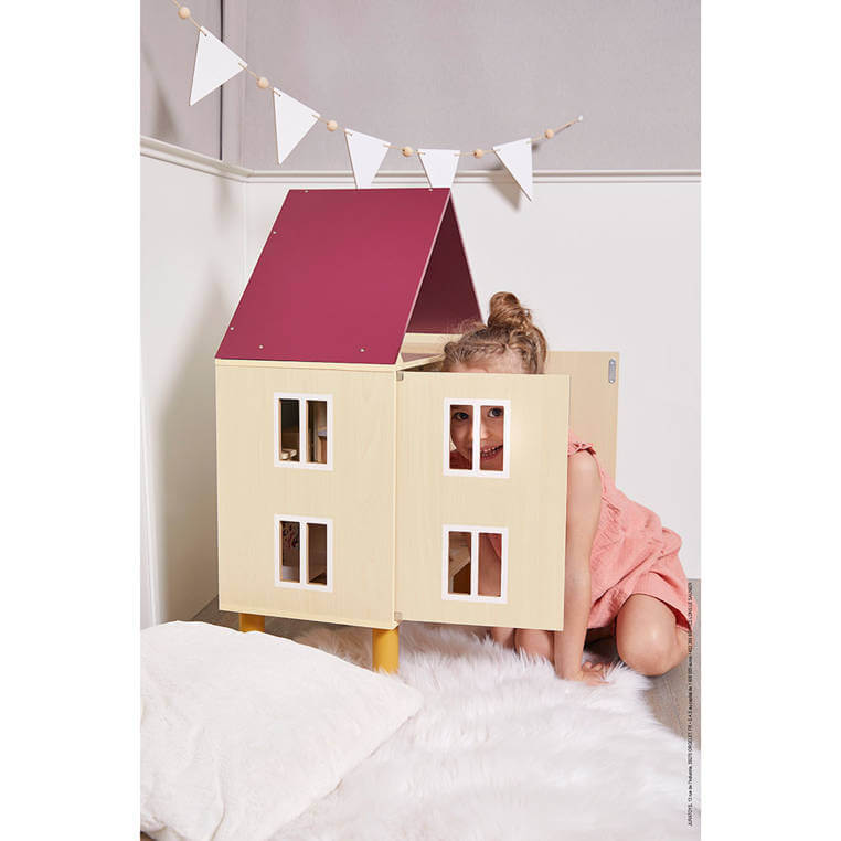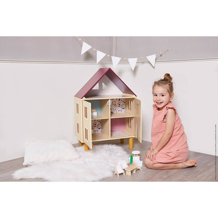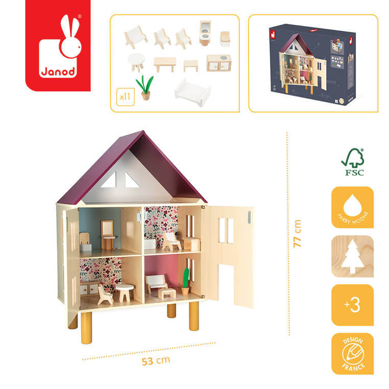 Piętrowy dom z dwuspadowym dachem i użytkowym poddaszem utrzymany jest naturalnym odcieniu drewna z elementami bieli, jasnego różu, bordo (dach) i w delikatny kwiatowy wzór. Jedna ze ścian domu otwiera się dwuskrzydłowo. Na jednym skrzydle znajdują się drzwi (na parterze) i prostokątne okno, na drugim – dwa okna. Oprócz tego okna znajdują się na obu bocznych ścianach oraz na strychu. W zestawie są także: łóżko, dwa fotele, kanapa, podnóżek, prostokątny stół, okrągły stół, umywalka z lustrem, toaleta, szafka kuchenna oraz roślina doniczkowa. Elementy te są starannie wykonane i bardzo estetyczne, a zabawa nimi to czysta przyjemność – meblowanie domu i organizowanie w nim życia lalkom pomaga dzieciom oswajać się z codziennością i przyswajać zasady społecznych zachowań.