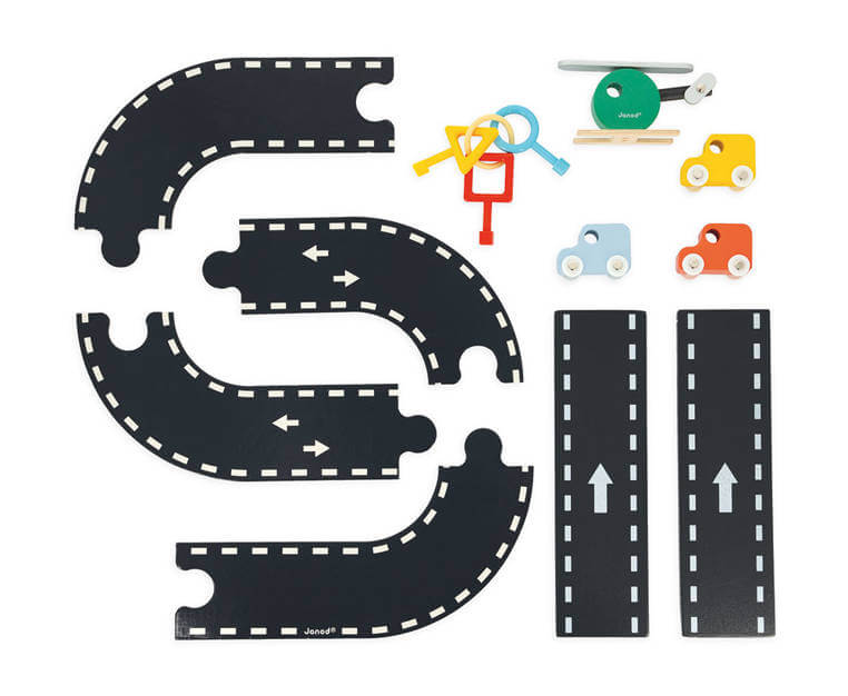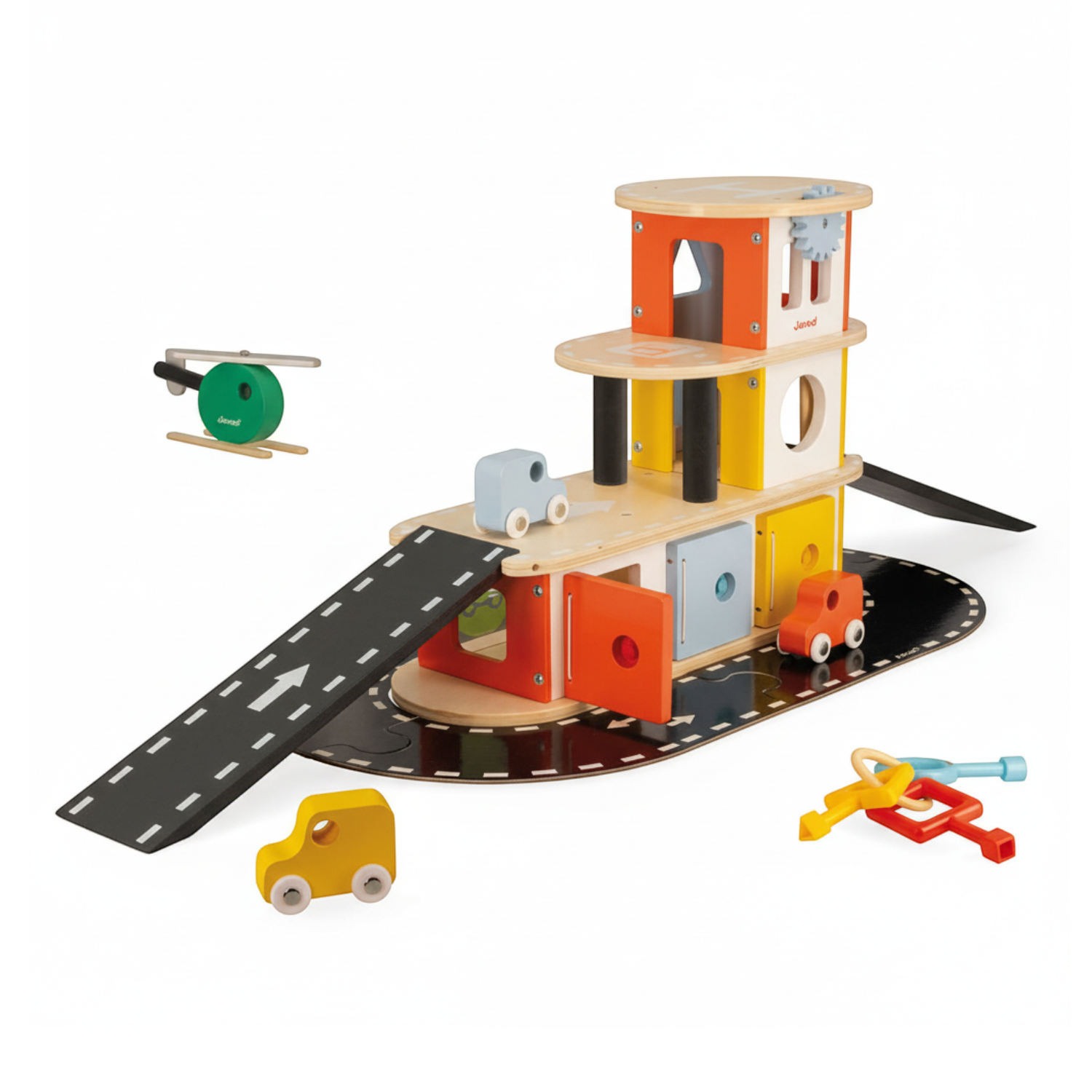 Komplet składa się z kilkupoziomowego (3 kondygnacje!) garażu wraz z akcesoriami: 3 autami i helikopterem. Na najniższym piętrze znajdują się trzy boxy, otwierane dołączonymi do zestawu plastikowymi kluczykami o różnych kształtach geometrycznych (funkcja sortera). Budynek posiada dwa podjazdy, mechaniczną windę (na koło zębate) oraz lądowisko dla helikopterów. Zestaw pozwala na tworzenie wielu scenariuszy zabaw. Zabawka została zaprojektowana we Francji. Idealnie nadaje się na prezent.