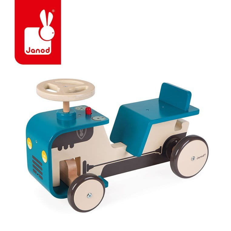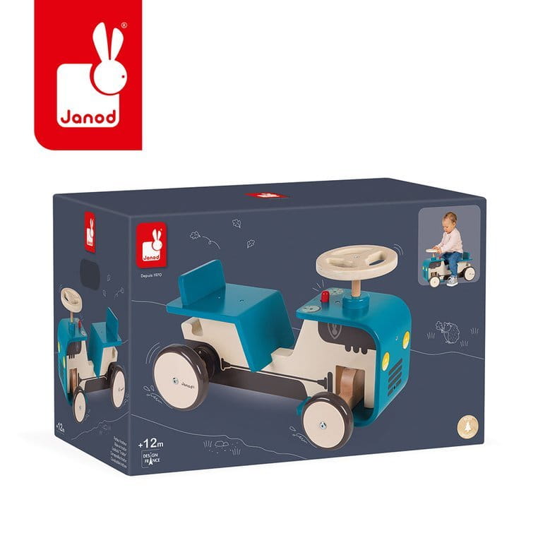 Drewniany jeździk Traktor francuskiej marki JANOD to idealna zabawka dla aktywnych dzieci od 1. roku życia, do domu i na podwórko. Starannie wykonany, z najlepszej jakości materiałów i ogromną dbałością o estetykę. Ma ergonomiczną zaokrągloną budowę (gięte drewno), nadającą mu stylowy charakter, siedzisko z niskim oparciem dla większej wygody, umieszczone na optymalnej wysokości (21 cm), co ułatwia dziecku samodzielne wsiadanie i zsiadanie. Lekka konstrukcja sprawia, że pojazd jest łatwy w prowadzeniu i utrzymywaniu w równowadze. Duże koła są stabilne i szeroko rozstawione, wykończone gumą, dzięki czemu nie rysują podłogi w domu. Jeździk posiada ergonomiczną drewnianą, obracaną kierownicę i przycisk, imitujący dźwięk klaksonu. Pojazd jest niebieski z namalowanym silnikiem, charakterystycznym dla traktora, światłami, licznikiem i wskaźnikiem baku oraz otworami wentylacyjnymi na masce. Nauczy dziecko utrzymywania równowagi i koordynacji, będzie doskonałym wprowadzeniem do nauki jazdy na rowerku biegowym.