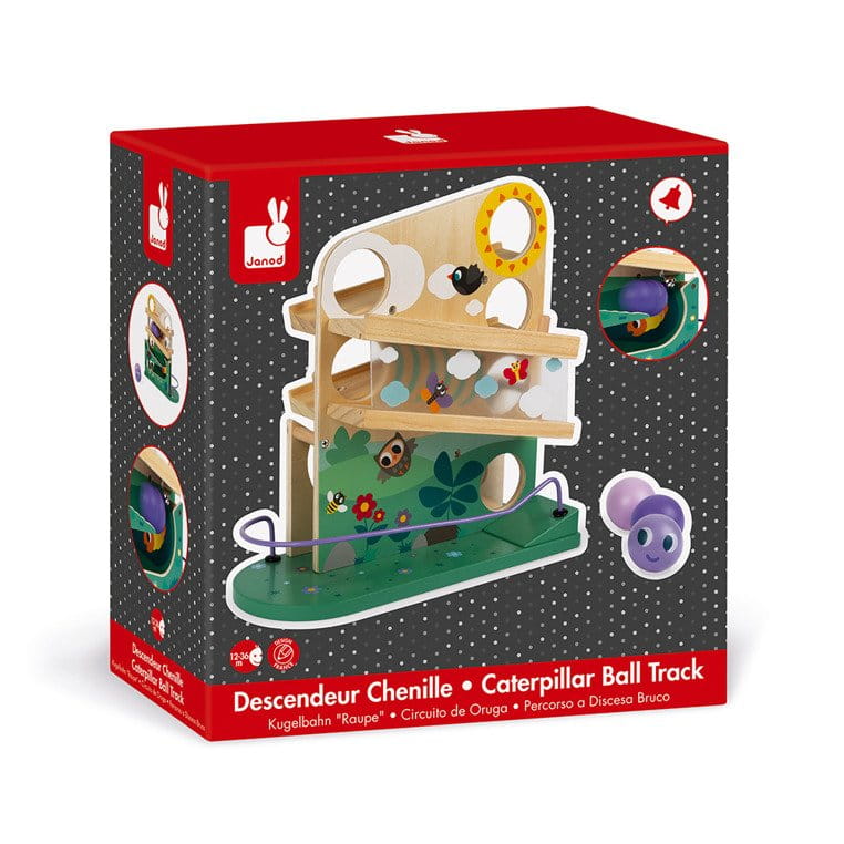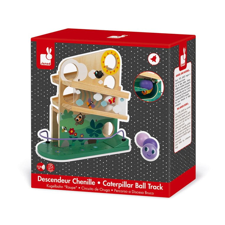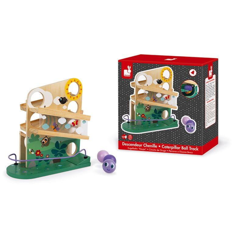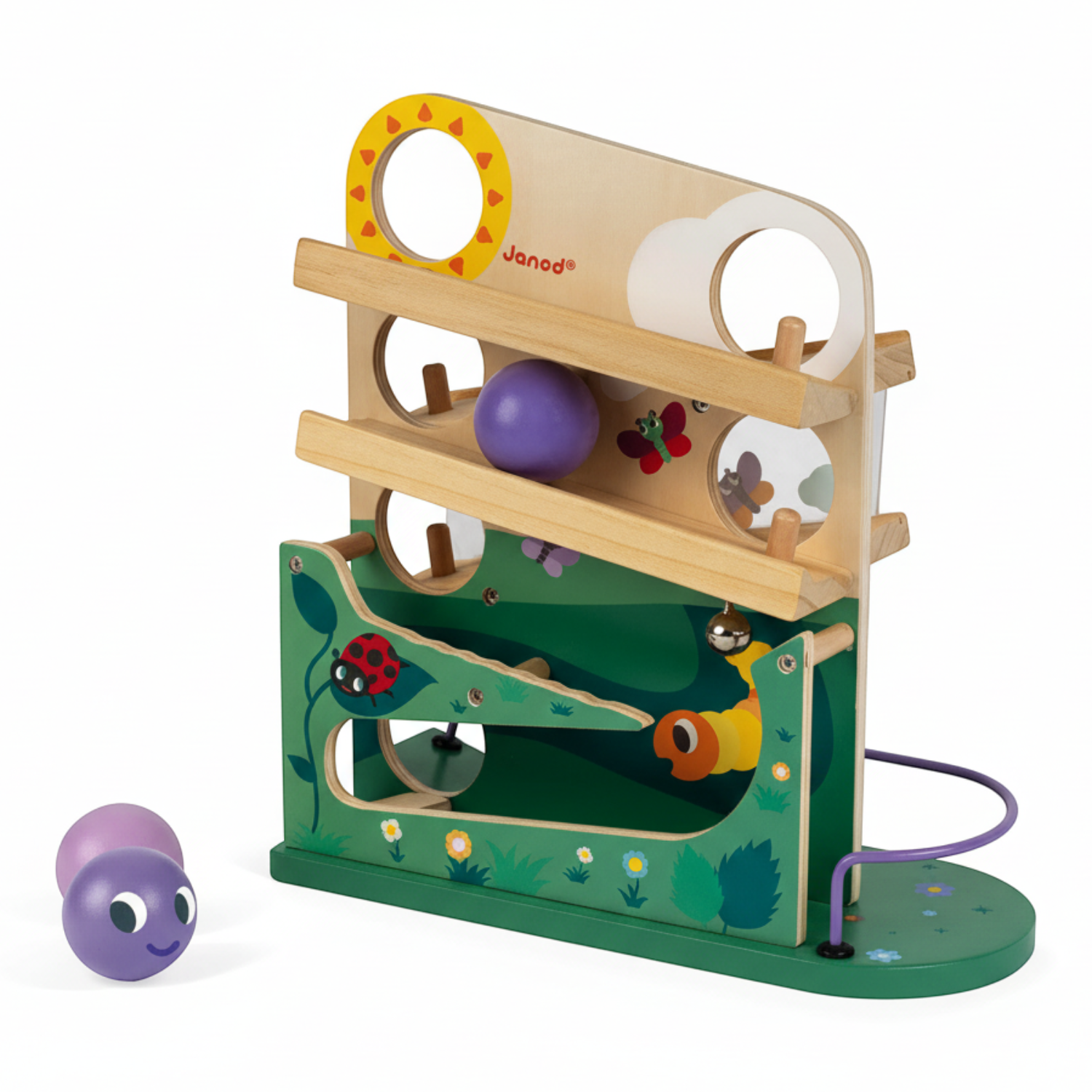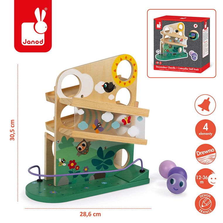 Zestaw składa się z dwupiętrowej rampy-łąki z okrągłymi okienkami, przez które można wrzucać piłeczki, aby toczyły się w dół. Trzy piłeczki w różnych odcieniach fioletu ułożone kolejno tworzą małą sympatyczną gąsieniczkę. Mają poręczną wielkość i są wygodne do trzymania w małych rączkach. Przy dolnej platformie rampy znajduje się dzwoneczek, którego przyjemny dźwięk informuje dziecko, że piłeczka dotarła do celu. Przeźroczysta ścianka wzdłuż jednej z platform rampy oraz metalowa barierka u jej podstawy zapobiegają dalszemu wypadnięciu piłeczek z toru, dzięki czemu nie gubią się w trakcie zabawy. Zabawka została zaprojektowana we Francji. Zapakowana w estetyczne, kartonowe pudełko. Idealnie nadaje się na prezent.