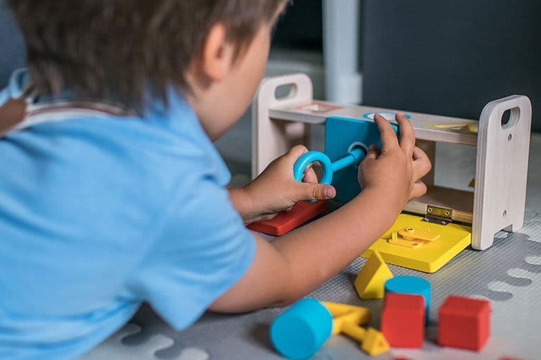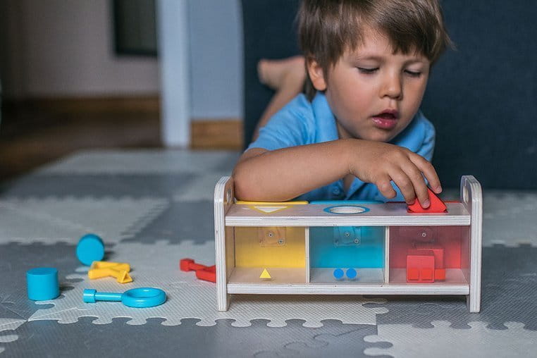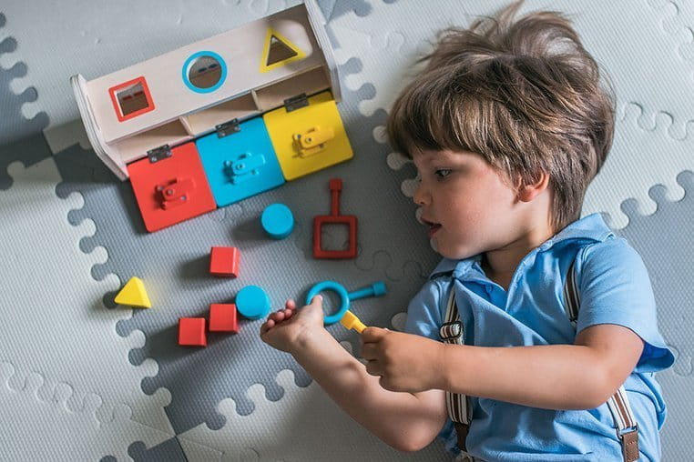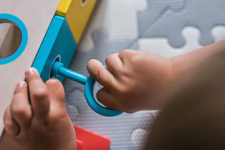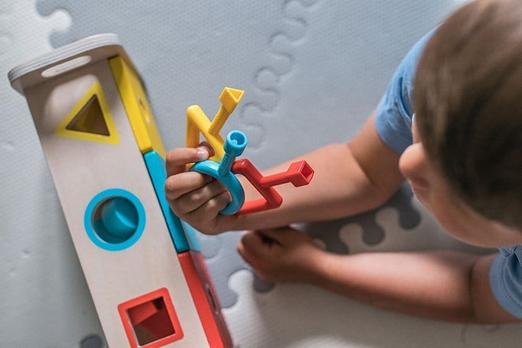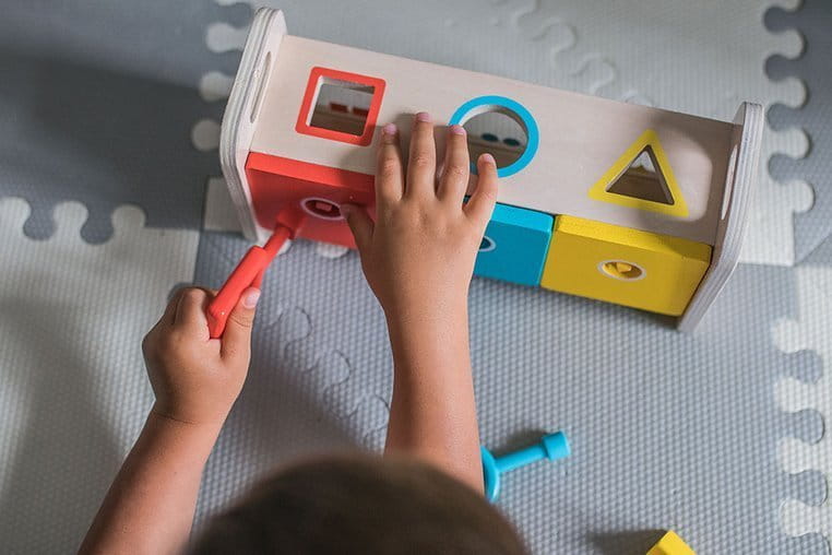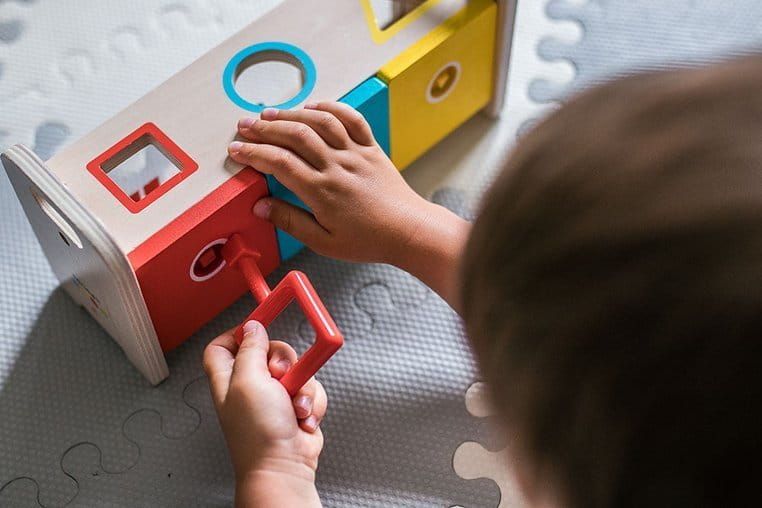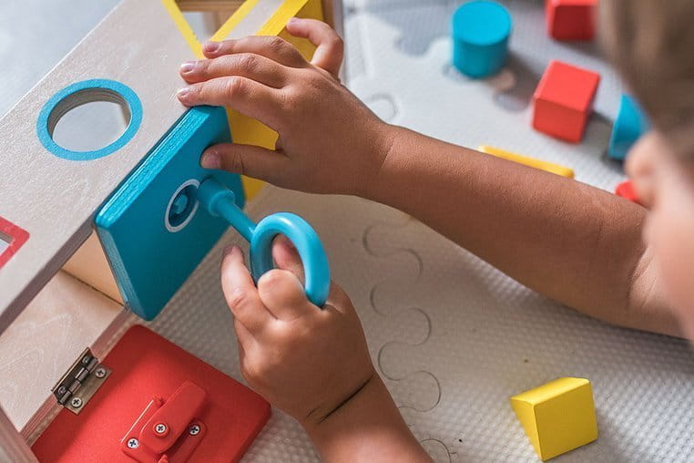 Drewniany sorter z kluczykami jest idealnym wstępem do nauki kształtów i kolorów