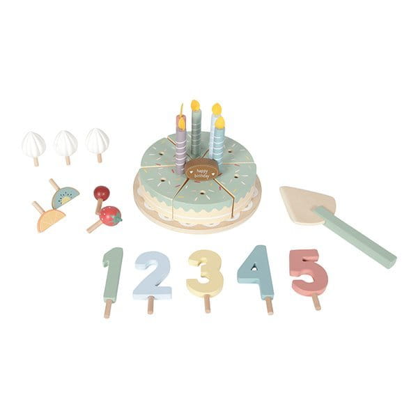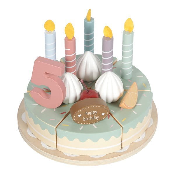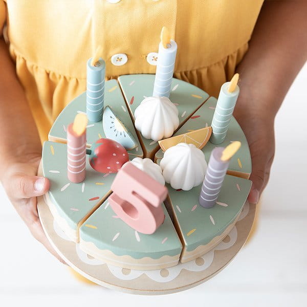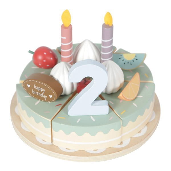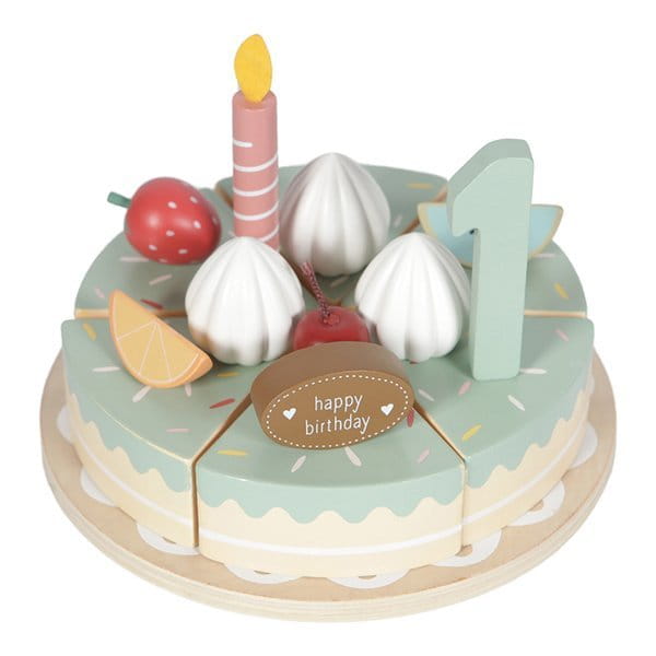 Wykonany z dobrej jakości drewna, w pięknych kolorach, malowany bezpiecznymi farbami dla dzieci. W skład tortu wchodzą: 6 kawałków tortu, 5 świeczek, 3 kuleczki bitej śmietany, 1 dekoracja czekoladowa, 4 owoce, łopatka do nakładania. Kawałki w torcie można łączyć i rozdzielać dzięki rzepom. Torcik zapewni długie godziny zabawy.