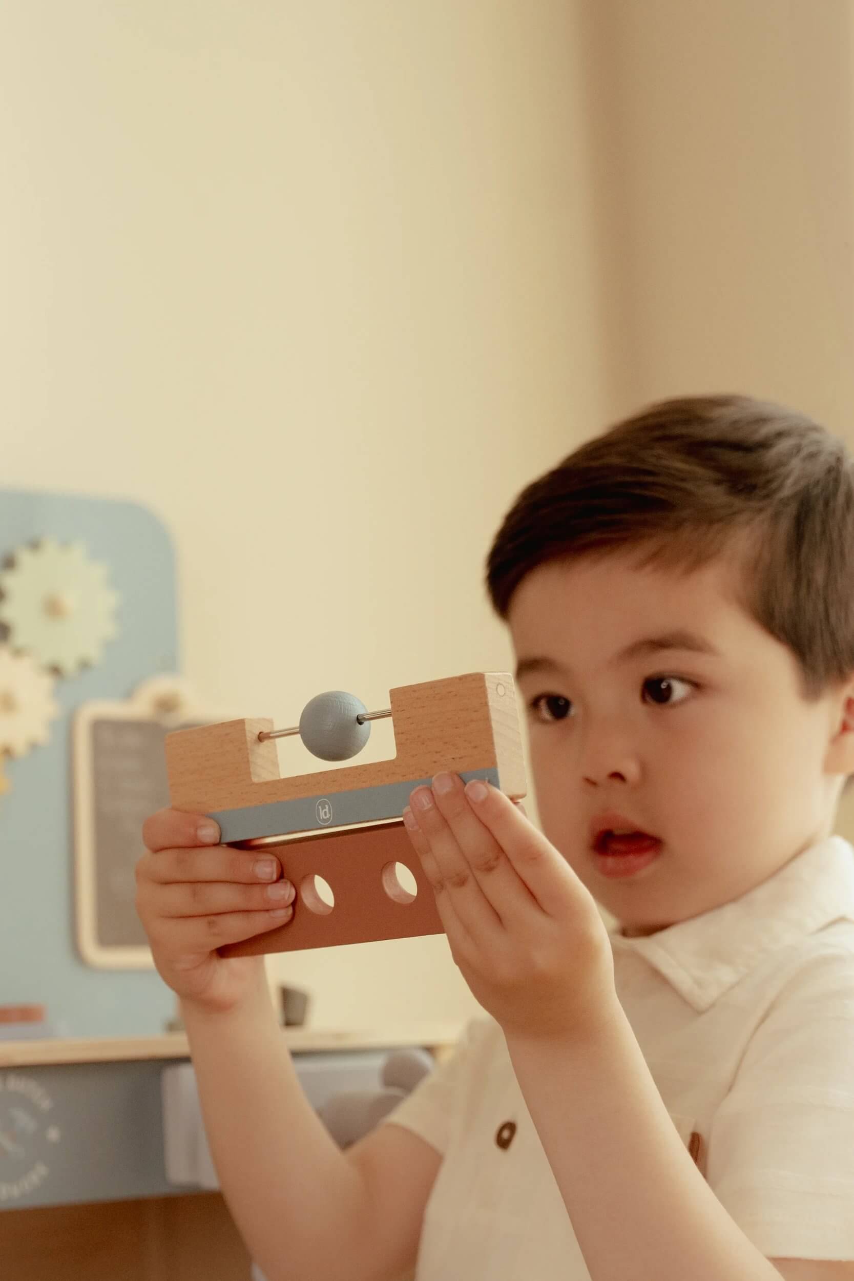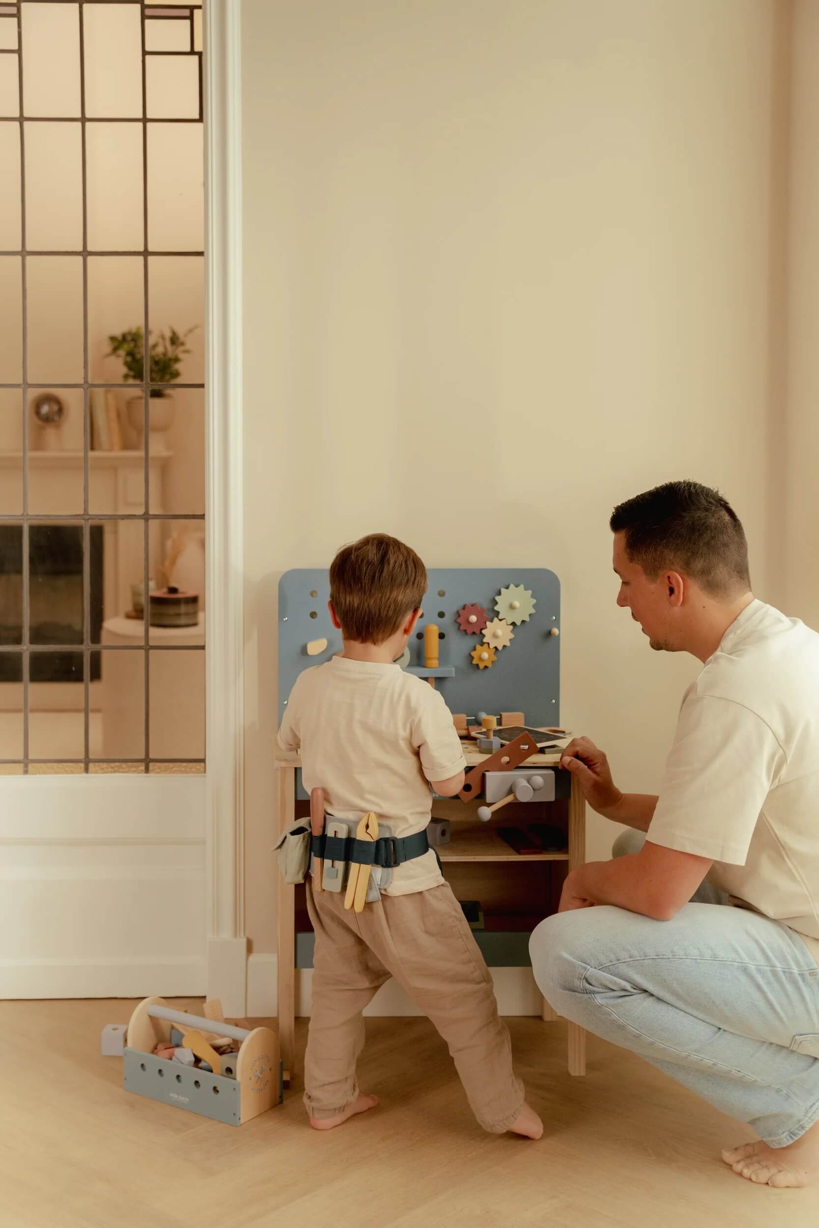 W zestawie znajdziemy drewniane śrubki, młotek oraz tabliczkę małego majsterkowicza do notowania kredą. Warsztat utrzymany w pięknej, zupełnie nowej kolorystyce, wykonany z drewna z certyfikatem FSC.