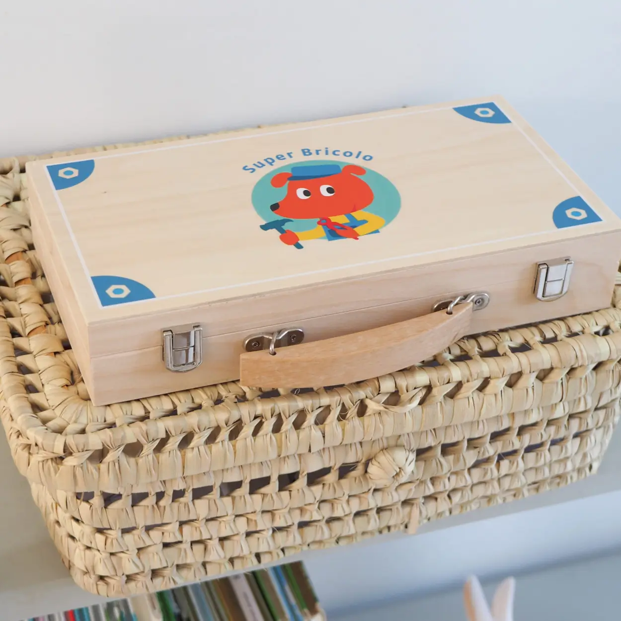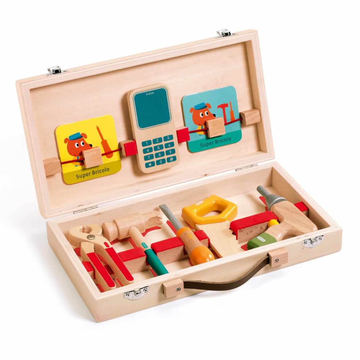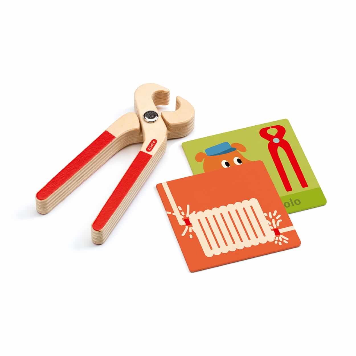 Drewniana skrzynka z narzędziami zawiera: młotek, piłę, śrubokręt, wiertarkę, szczypce i osiem kart, na których przedstawione są historyjki jakie narzędzie jest potrzebne do wykonana zadania.