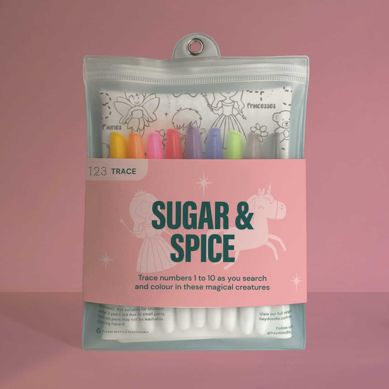 Australijska firma HeyDoodle zaprojektowała opakowania tak, aby było ładne i praktyczne. Maty idealnie sprawdzą się na prezent, a potem w zabawie w domu, w podróży, w samochodzie, u babci i cioci, a po zabawie, można ponownie schować flamastry i matę do estetycznego opakowania.