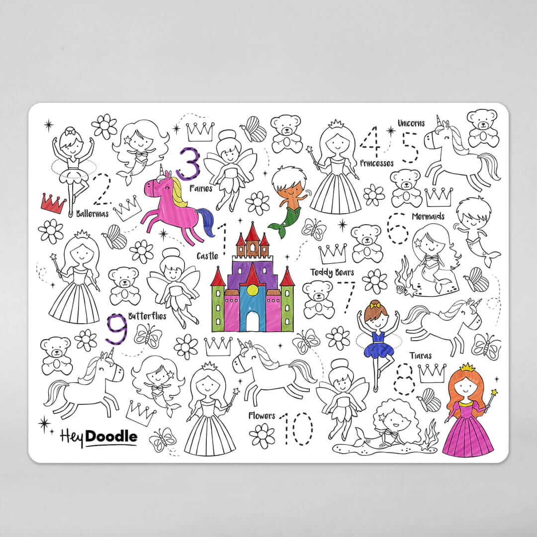 Koloruj duży zamek, wróżki, baletnice, jednorożce i syrenki (wszystko co małe dziewczynki kochają), ćwicz liczenie i pisanie cyferek. Duża silikonowa mata A3 ma do kolorowania bajkowe postacie i cyferki do pisania po śladzie. Cyferki odpowiadają liczbie bajkowych postaci ma macie. Znajdź je wszystkie, policz i napisz liczbę. Po zabawie matę można wyczyścić i użyć ponownie, ponownie i ponownie kolorując, pisząc i ucząc się!
