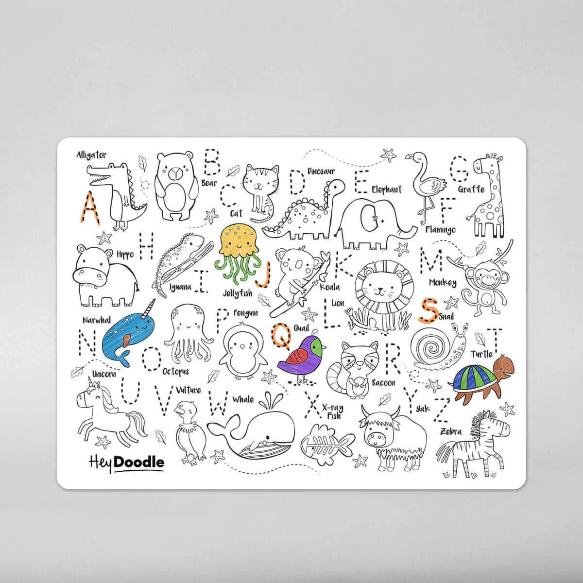 Koloruj i ćwicz pisanie literek, ucząc się nazw w języku angielskim. Silikonowa mata A3 ma do kolorowania zwierzęta i literki do pisania po śladzie, na które zaczyna się nazwa zwierzątka w języku angielskim. Po zabawie matę można wyczyścić i użyć ponownie, ponownie i ponownie kolorując, pisząc i ucząc się!
