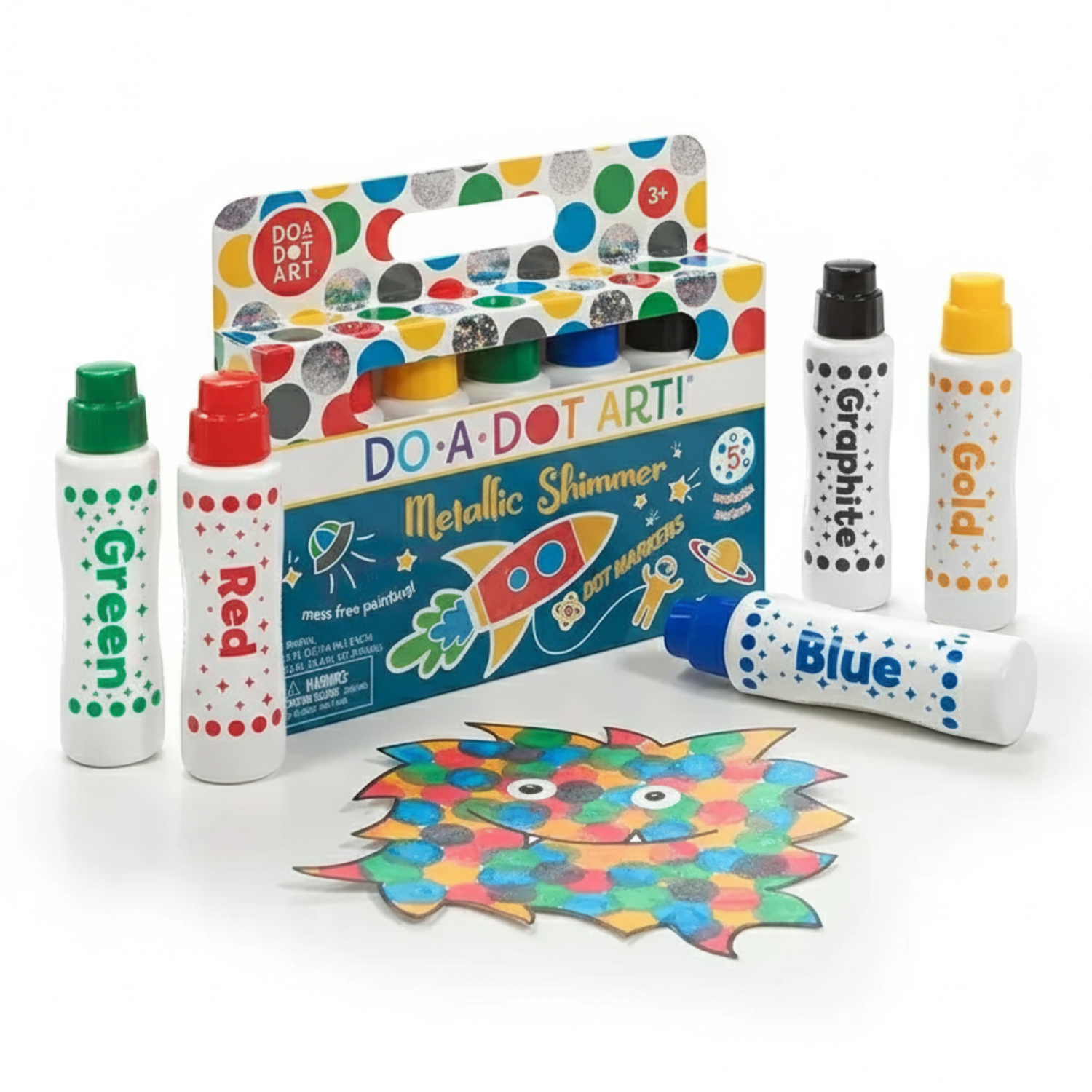 Flamastry Kropkowe stworzone przez Do-A-Dot Art to zmywalna farba w płynie w dużej, dopasowanej do rączek dziecka butelce, zakończonej dużą, miękką gąbeczką, która nie wysycha i zawsze pozostawia na kartce idealną kropkę. Butelka zawiera nietoksyczną, zmywalną farbę, szybko wysychającą, w żywych kolorach, która nie rozlewa się, ani nie rozpryskuje. Zestaw flamastrów, w całości wyprodukowanych w USA, zawiera 5 markerów w metalicznych kolorach - złoty, grafitowy, niebieski, czerwony, zielony.