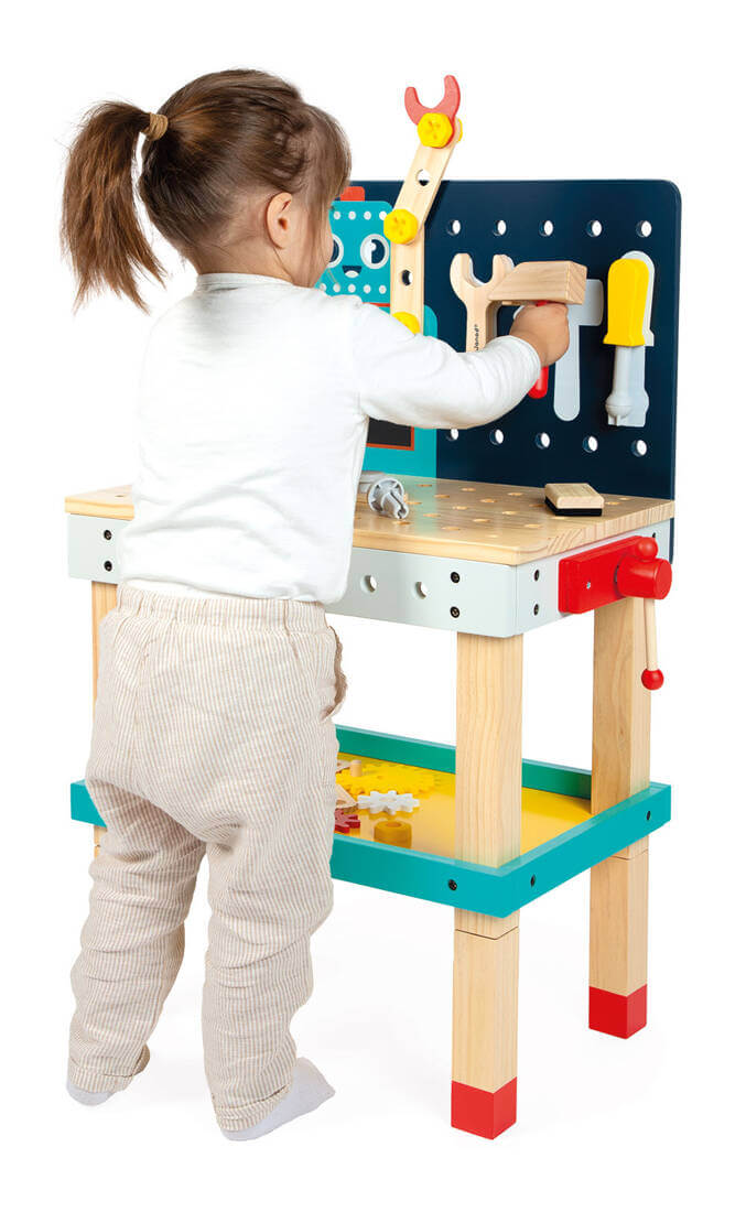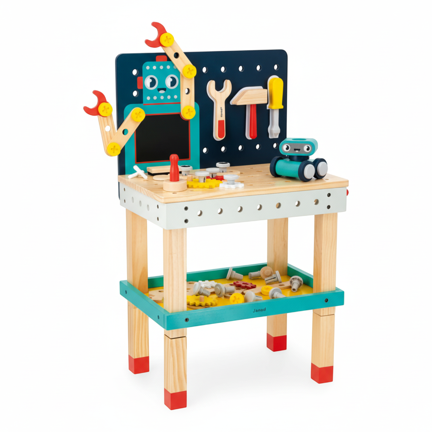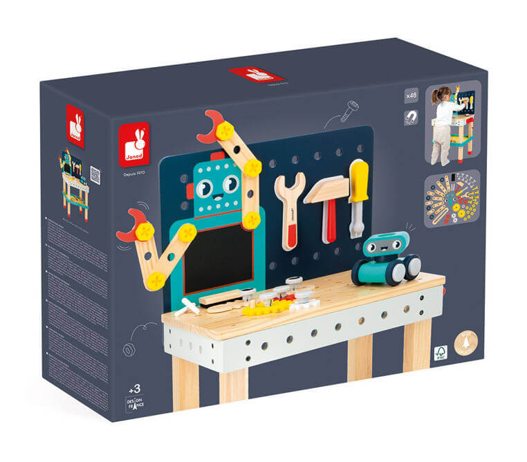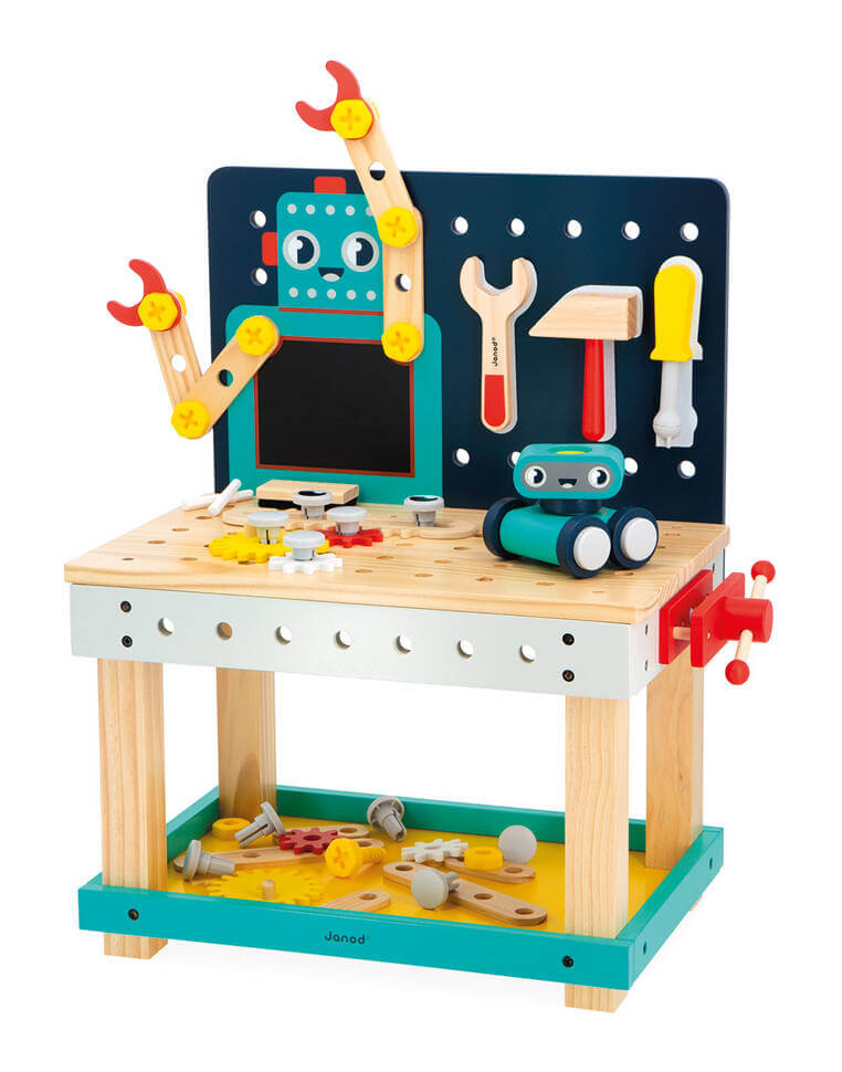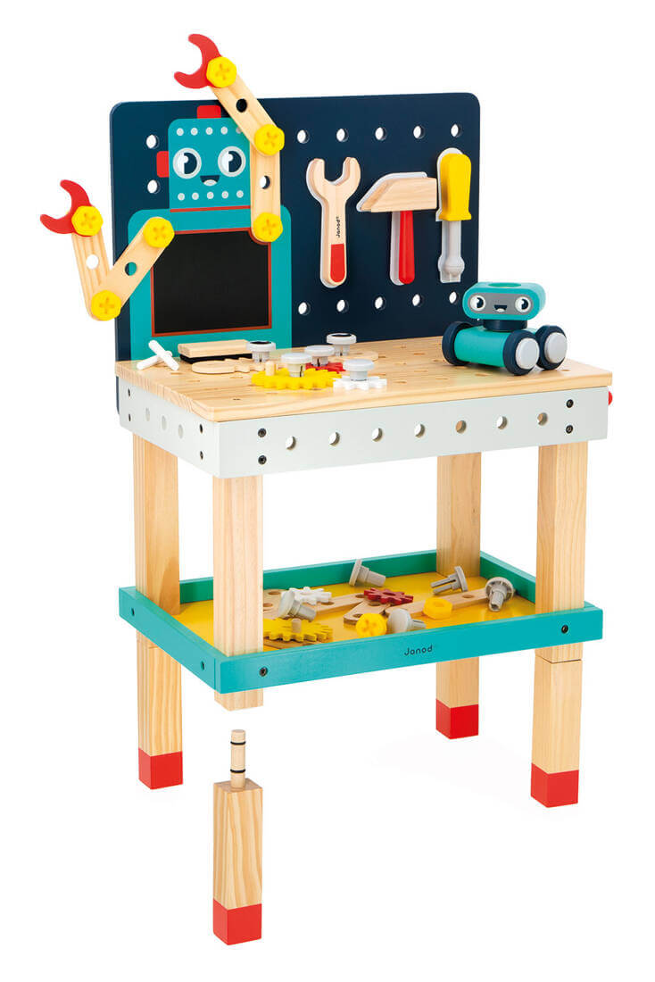 Drewniany, w pełni wyposażony stolik warsztatowy z narzędziami Robot z serii Brico'Kids francuskiej marki JANOD to idealny prezent dla małego majsterkowicza