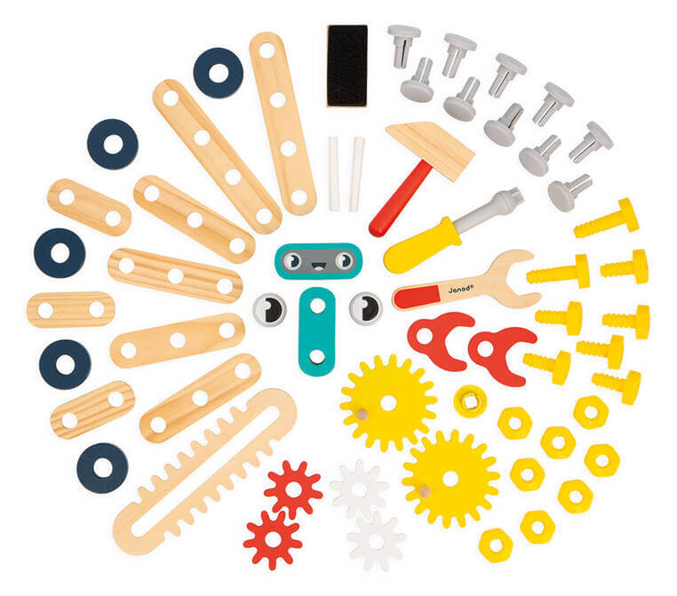 Zestaw składa się z 60 elementów: stołu na 4 stabilnych nogach ze ścianką, ozdobioną wizerunkiem robota i mini-tablicą na projekty lub notatki, wraz z kompletem śrubek, nakrętek, podkładek oraz kół zębatych, młotka, klucza i śrubokręta. Narzędzia są magnetyczne i przyczepiają się do ścianki warsztatu. Ponadto jest on wyposażony w blat roboczy, boczne imadło oraz dolną półkę do przechowywania. Może się nim bawić jednocześnie więcej niż jedno dziecko.