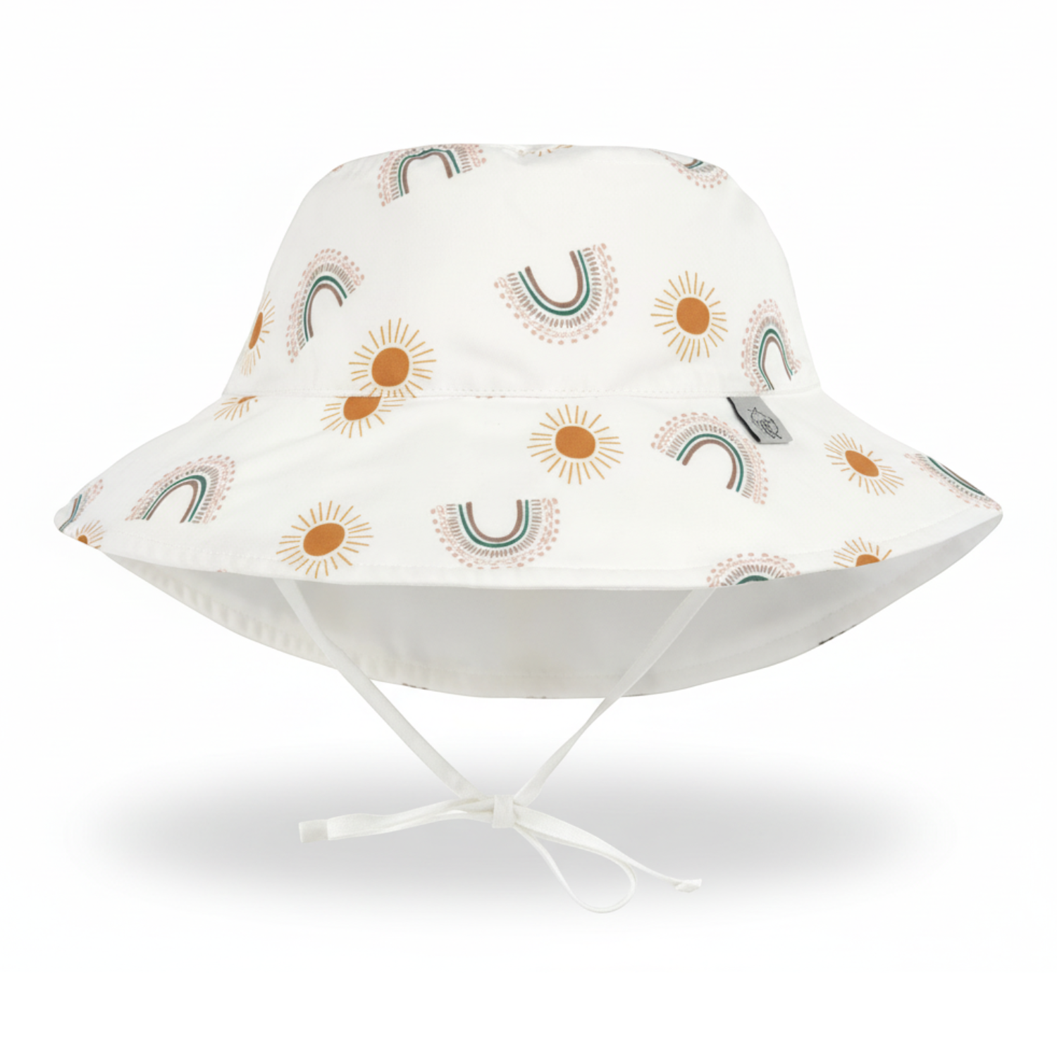 Wykonany jest z miękkiej, przyjemnej do noszenia i szybkoschnącej mikrofibry z faktorem UPF 80. Ma szerokie rondo. Jest idealny zarówno na odkryty basen, jak i na plażę, do kąpieli w jeziorze czy morzu oraz wszelkich wodnych zabaw. Nie przemaka i jest łatwy w pielęgnacji. Dzięki bocznym sznureczkom może być stabilnie wiązany pod szyją. Dwustronny: z jednej strony jest wzorzysty, po drugiej stronie - biały. Wzór Rainbow (Tęcza) to multiprint w tęcze w kilku odcieniach różu, beżu i szarości oraz słoneczka w odcieniu ochry na białym tle.