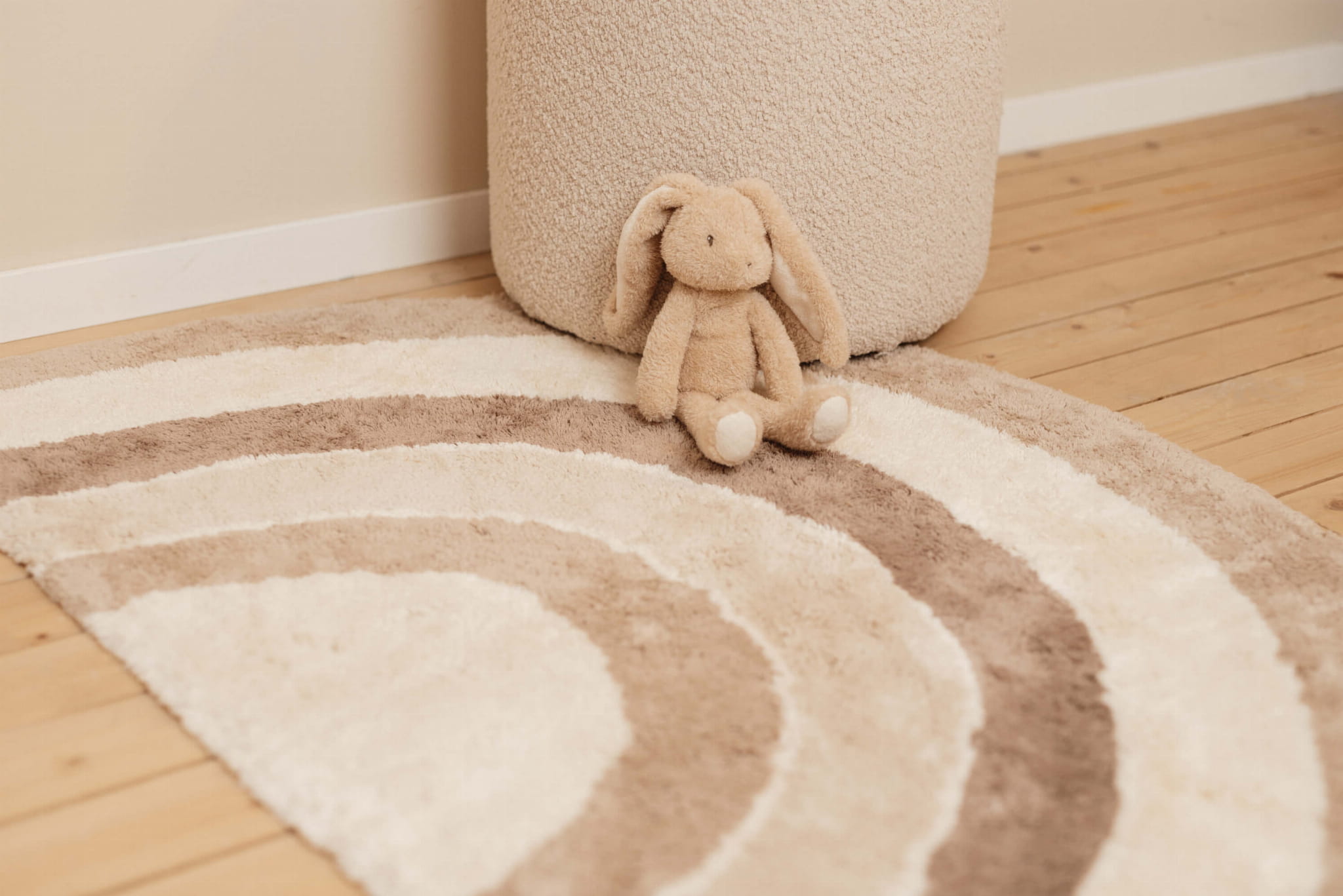 Dywanik w kształcie tęczy o odcieniach beżu i brązu jest miękki i przyjemny dla małych stópek. Wykonany z wysokiej jakości organicznej bawełny z antypoślizgowym spodem, dywanik można łatwo czyścić w pralce. Będzie doskonałym wyborem do każdego pokoju.