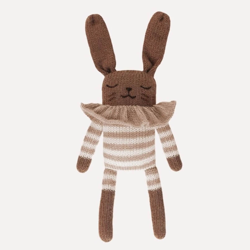 Ta zabawka, wykonana jest ręcznie w warsztatach sprawiedliwego handlu w Boliwii, wspiera inteligentną produkcję, szanującą Ziemię i prawa człowieka. Podobnie jak wszystkie dzianinowe zabawki, ten mały króliczek jest wykonany z czystej wełny baby alpaki, która jest antybakteryjna i doskonale dostosowana do wrażliwej skóry.